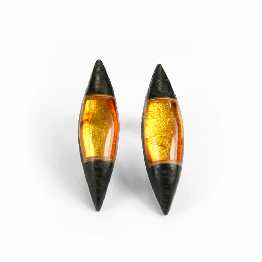 Para kolczyków na sztyft wykonana ręcznie z wyselekcjonowanego bursztynu bałtyckiego w kolorze złotym, srebra wysokiej próby, złota płatkowego pod bursztynem oraz szlachetnego drewna czarnego dębu.