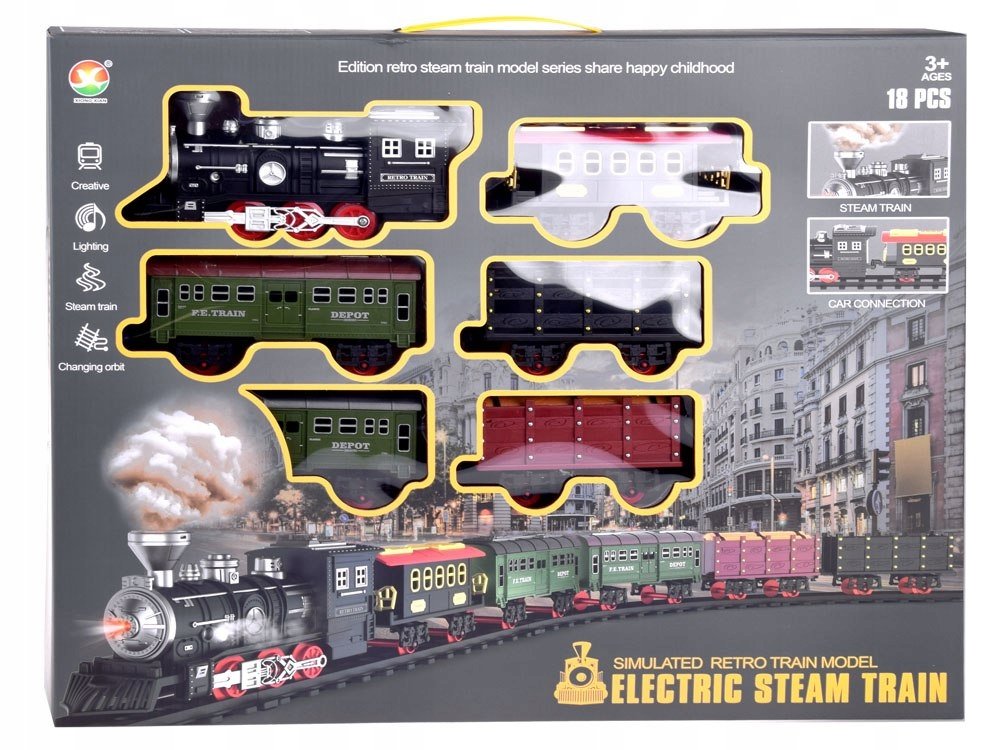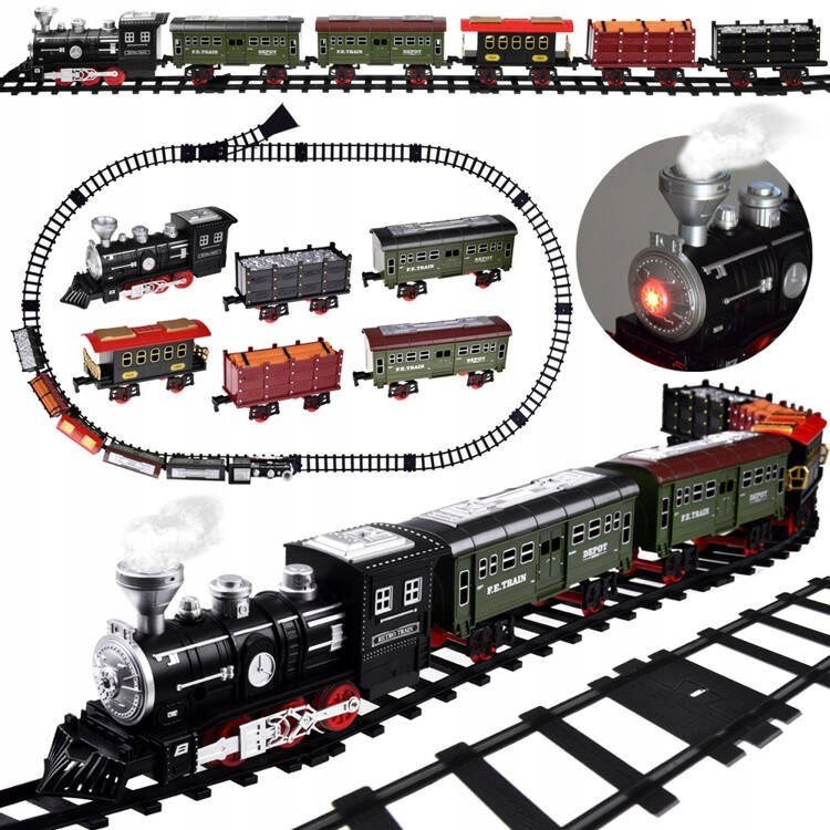 Kolejka z torami z lokomotywą i pięcioma wagonami, wyjąca odgłosy, świecąca i dymiąca parą wodną na pewno zachwyci każdego miłośnika pociągów i kolejek. Zestaw zawierający 18 elementów, został pięknie wykonany z dbałością o każdy nawet najmniejszy szczegół, co sprawia, że kolejka i wagoniki na żywo wyglądają naprawę fantastycznie. Wszystkie elementy zestawu zostały wykonane z wysokiej jakości tworzywa sztucznego.