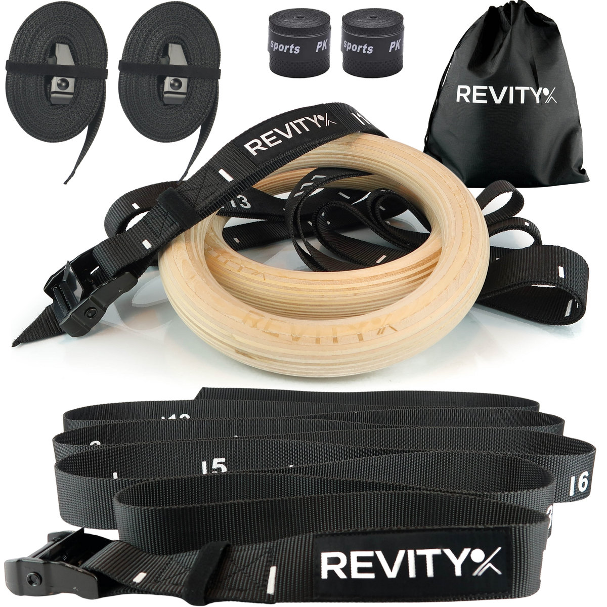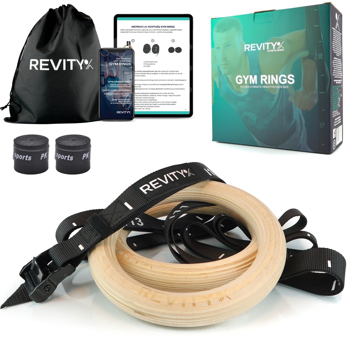 GYM RINGS marki REVITY to koła gimnastyczne wykonane z najwyższej jakości materiałów: pasów o bardzo wysokiej nośności, stalowych malowanych proszkowo sprzączek oraz drewnianych pierścieni. Pasy zdecydowaliśmy wykonać nieco szersze niż w przypadku innych modeli dostępnych na rynku (38 mm) oraz nieco grubsze aby zapewnić lepszy chwyt i rozłożenie obciążenia. Zestaw jest kompletny i w jego skład wchodzą: 2 drewniane koła, 2 pasy nośne ze sprzączkami oraz miarką, 2 owijki do kółek (poprawa chwytu) oraz woreczka do przechowywania.