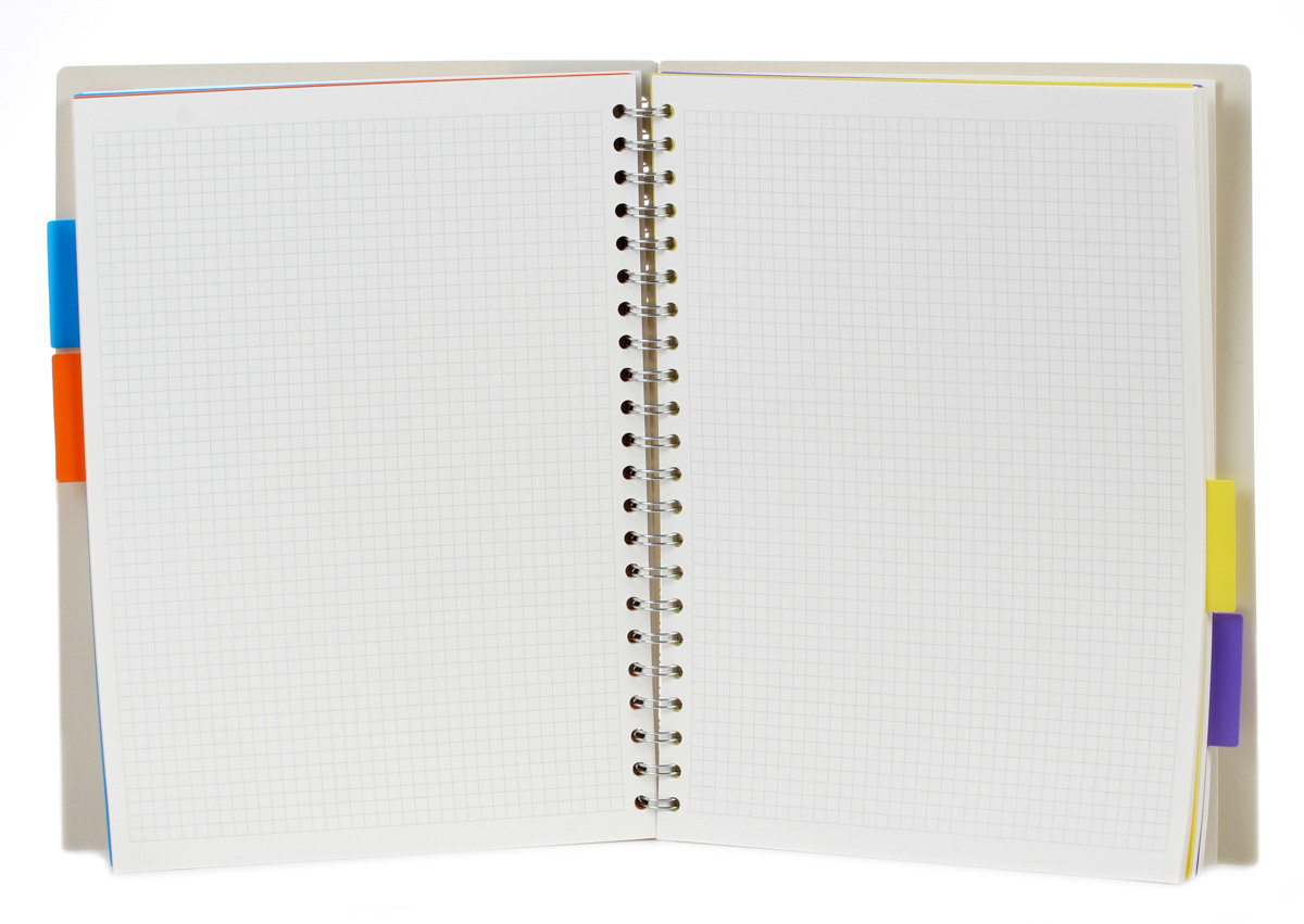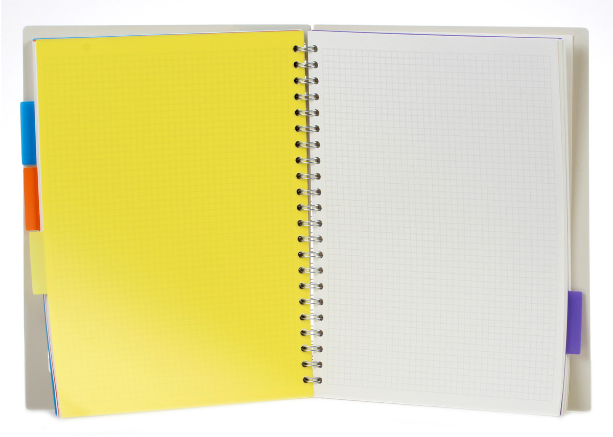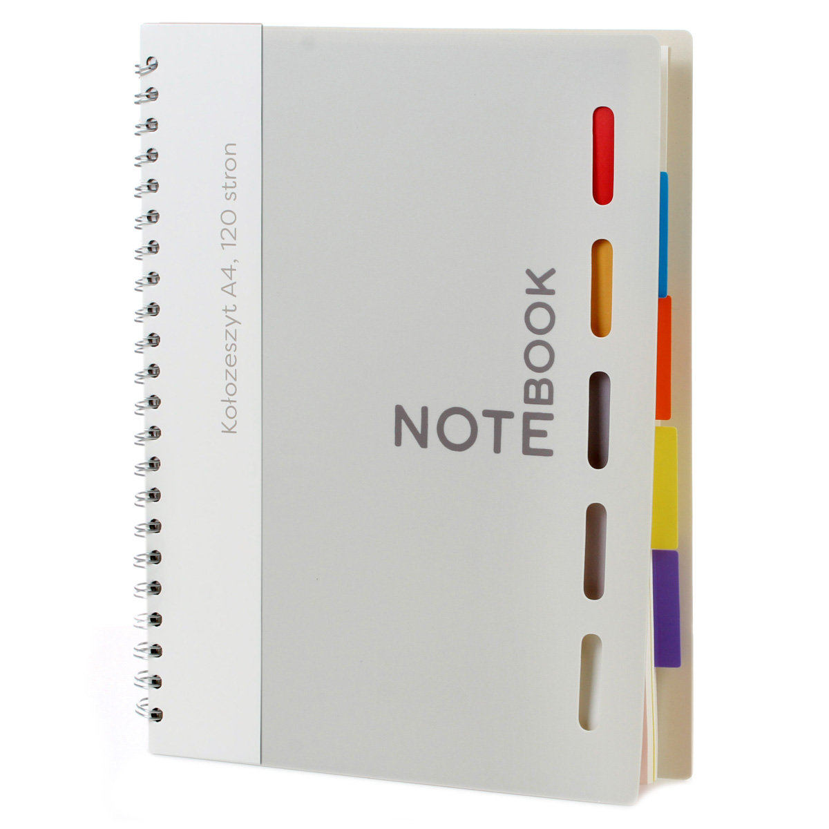 Zadruk: kratka Format A4 Liczba kartek:120 Wewnątrz posiada 4 kolorowe przekładki, okładka szara