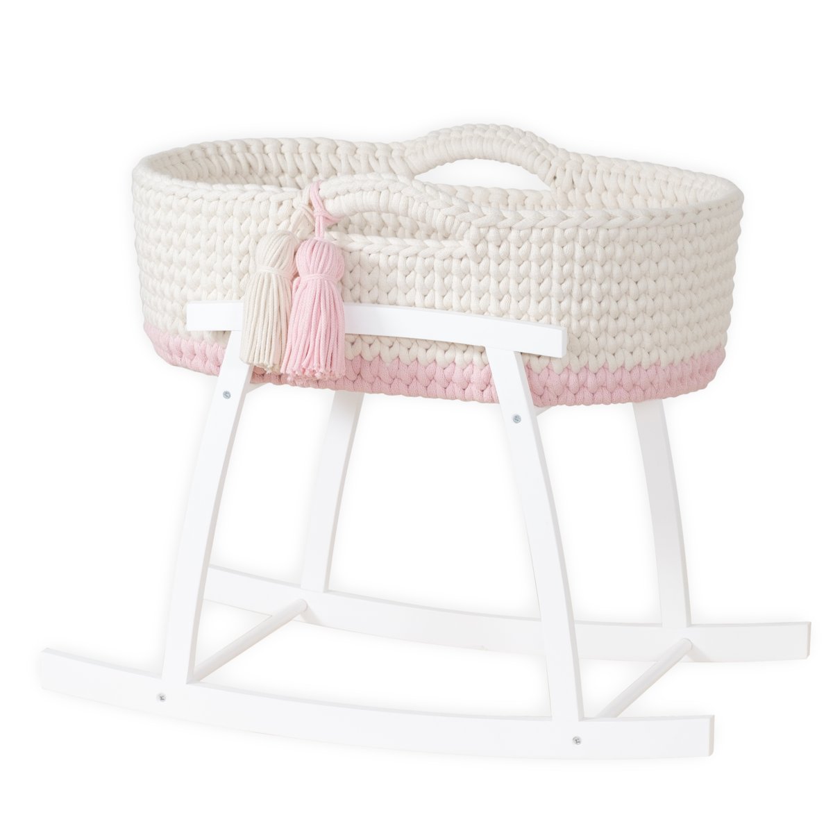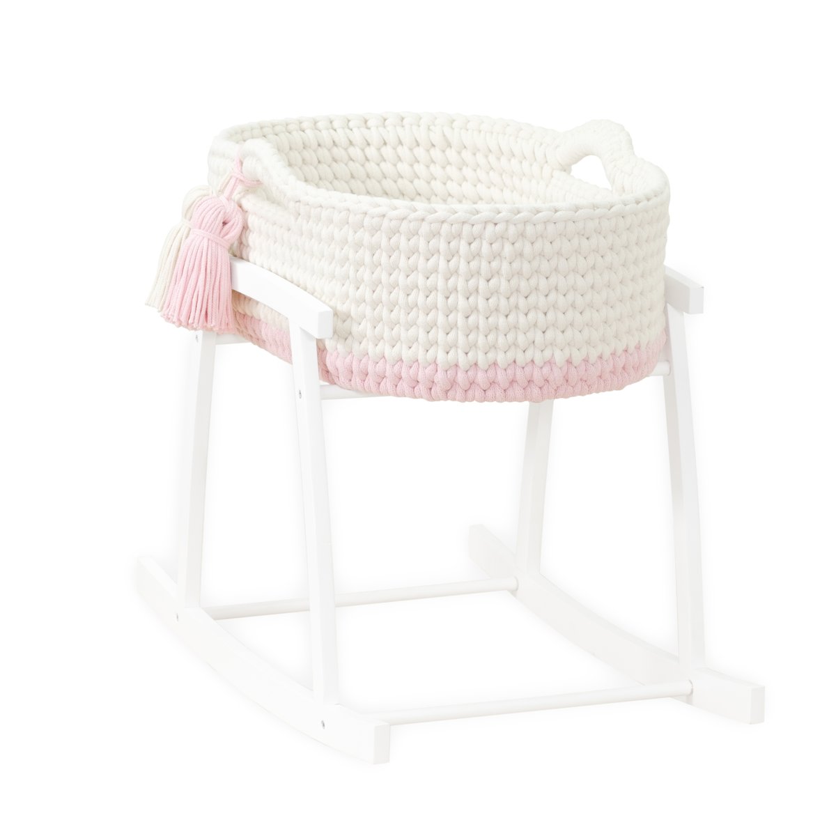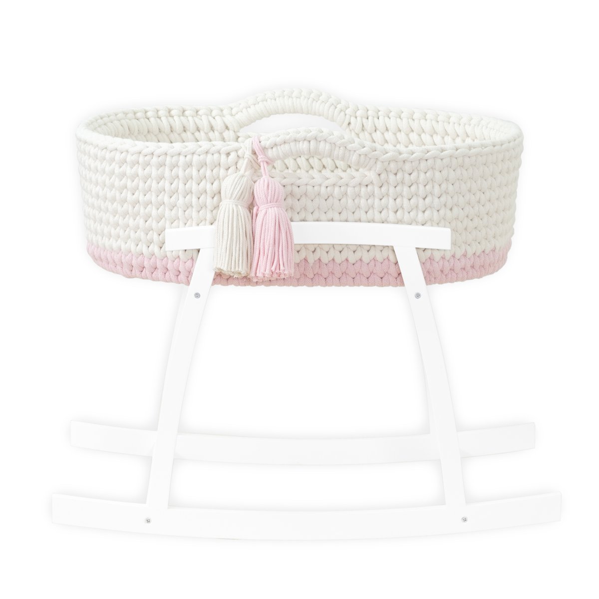 "RĘCZNIE WYKONANY KOSZ DLA LALKI Z ZESTAWEM POŚCIELI, FRĘDZLAMI ORAZ STELAŻEM BUJANYM - BIAŁYM.Kosz Mojżesza z bujakiem w wersji dla lalek to świetna propozycja dla starszego rodzeństwa, by ...