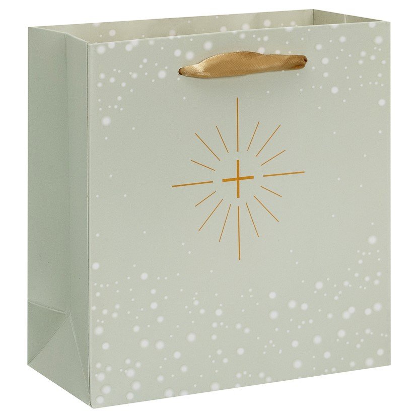 | Nazwa: | Torba prezentowa na komunię, rozmiar CD, zielona ze złotym krzyżem |