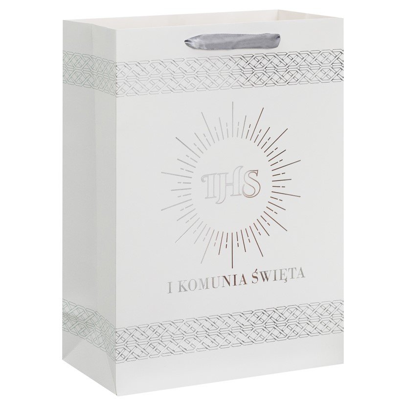 | Nazwa: | Torba prezentowa na komunię, rozmiar M, jasna z napisem IHS |