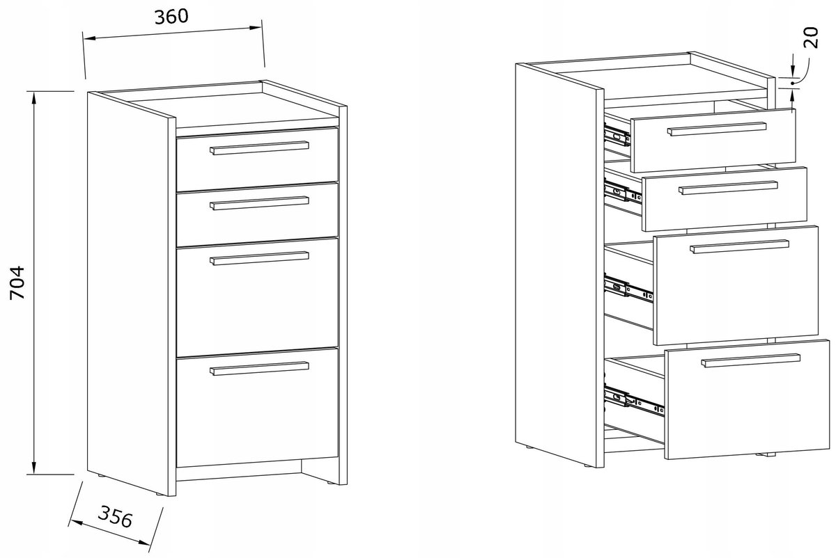 Perfekcyjne rozwiązanie dla wymagających przestrzeni - oferuje dwie wysokie i dwie niskie szuflady, umieszczone na metalowych prowadnicach kulowych H35, gwarantujących pełny wysuw i komfort użytkowania.