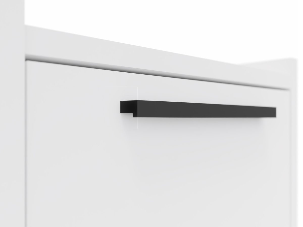 Czarne uchwyty z tworzywa sztucznego harmonijnie współgrają z wykończeniem w kolorze białym, dodając meblowi nowoczesnego sznytu.