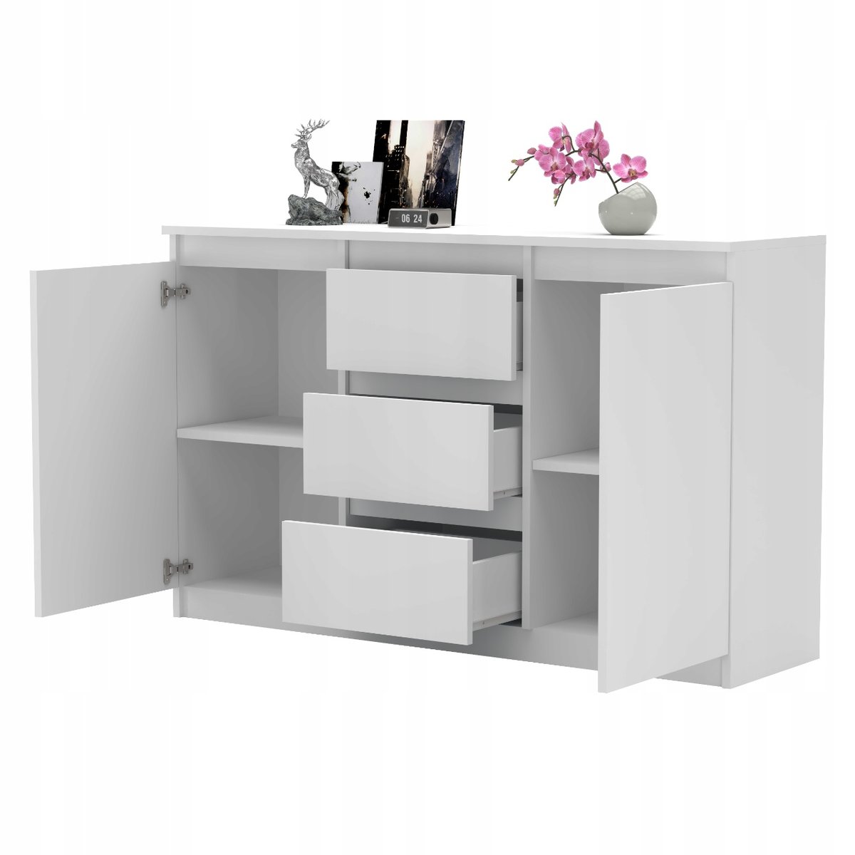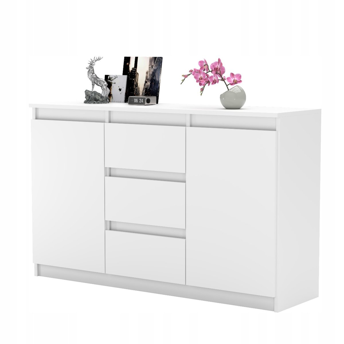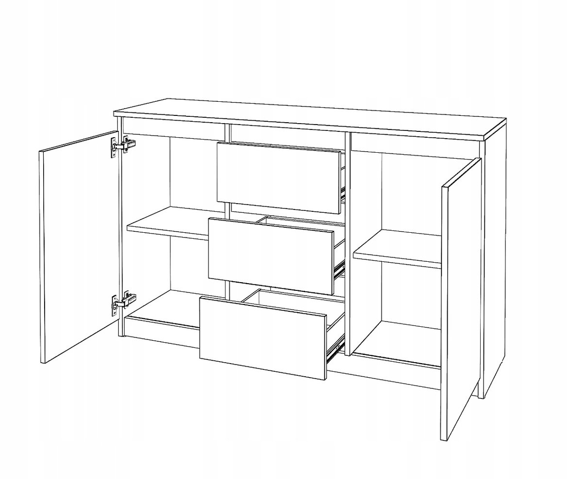 ✅ Tył komody wykonany z płyty HDF w kolorze białym.