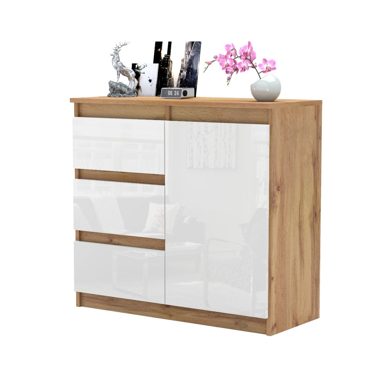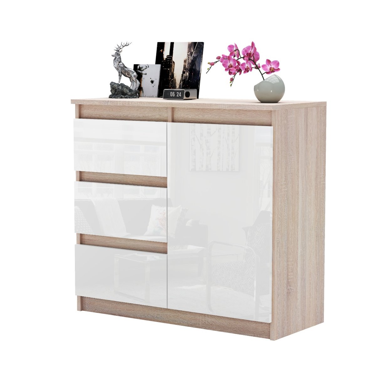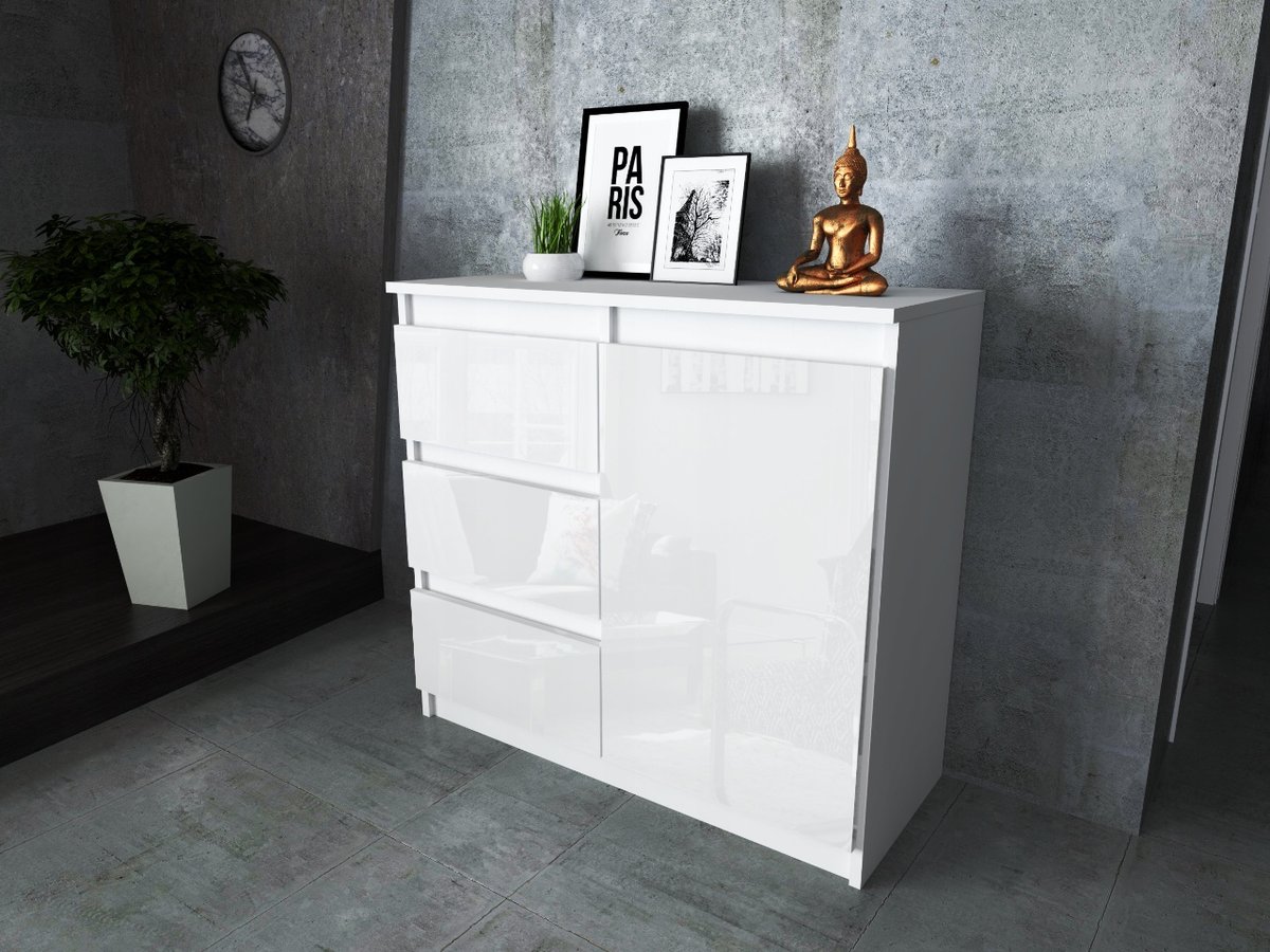 Komoda sprawdzi się w każdym mieszkaniu. Została wykonana ze starannie wyselekcjonowanych materiałów, co przekłada się nie tylko na efektowny design, ale również nieprzeciętną wytrzymałość. Uwagę przykuwa jej przepiękne i nowoczesne wzornictwo, genialnie wpasuje się w trendy wystroju wnętrz.