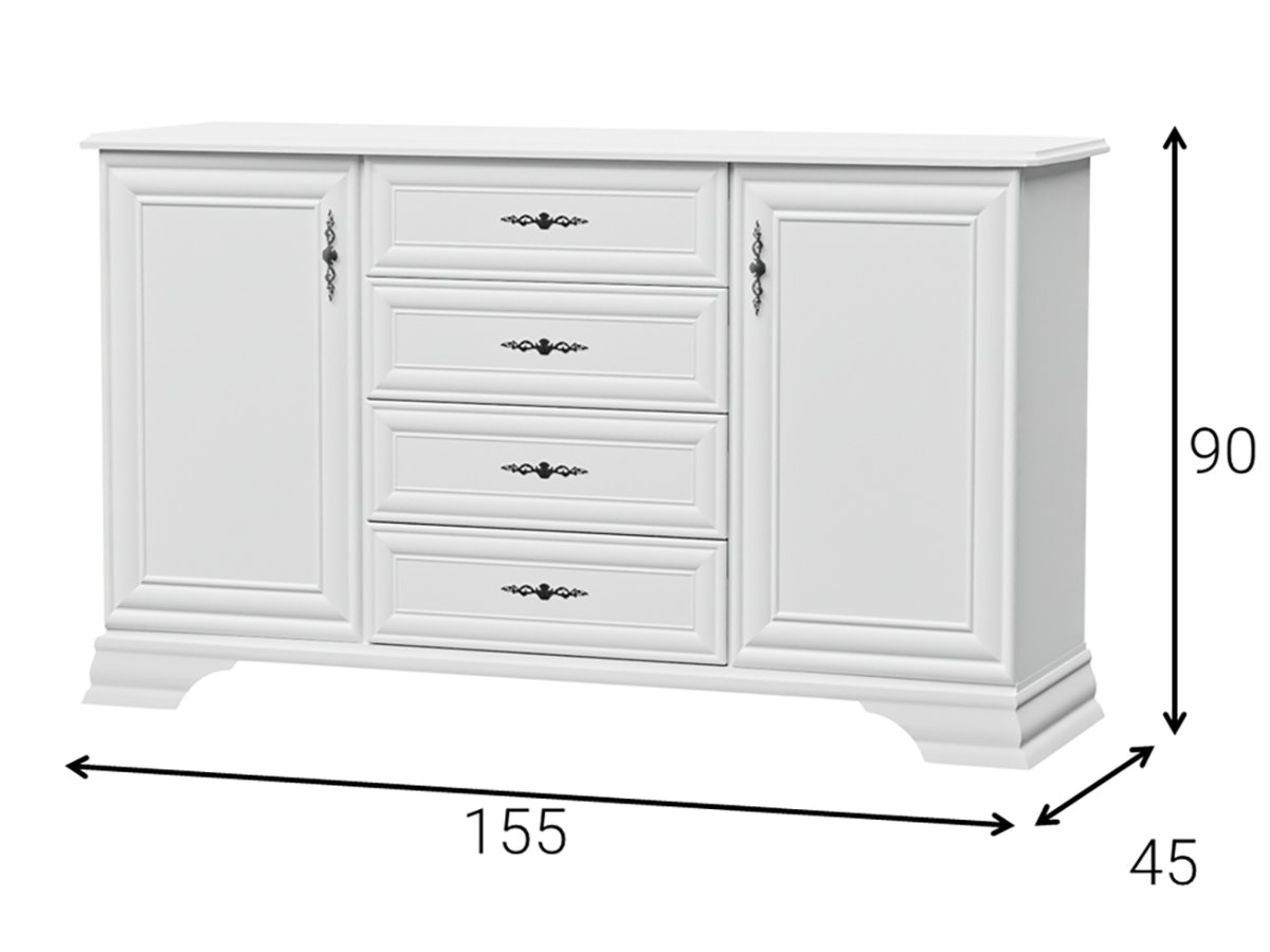 Duża komoda biała 4 szuflady 155 cm Wersal Komoda biały mat z 4 szufladami do przedpokoju Komoda biała matowa 155 cm do sypialni SPECYFIKACJA: kolor: matowa biel szerokość: 155 cm ...