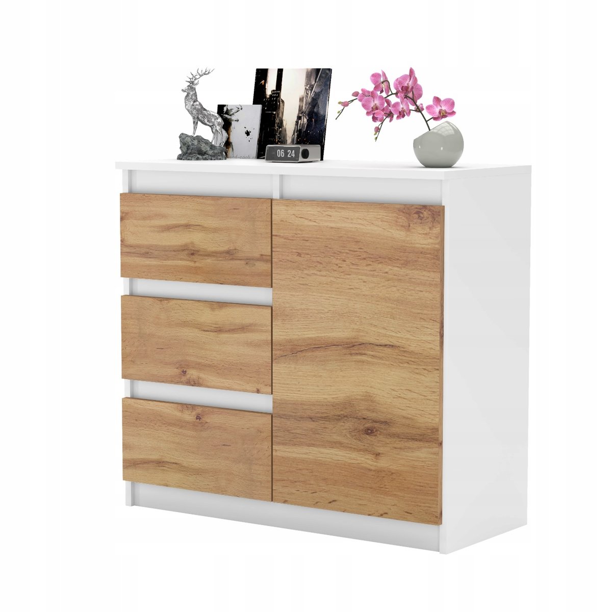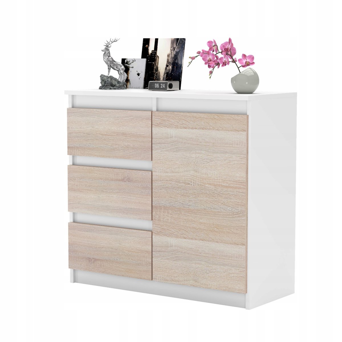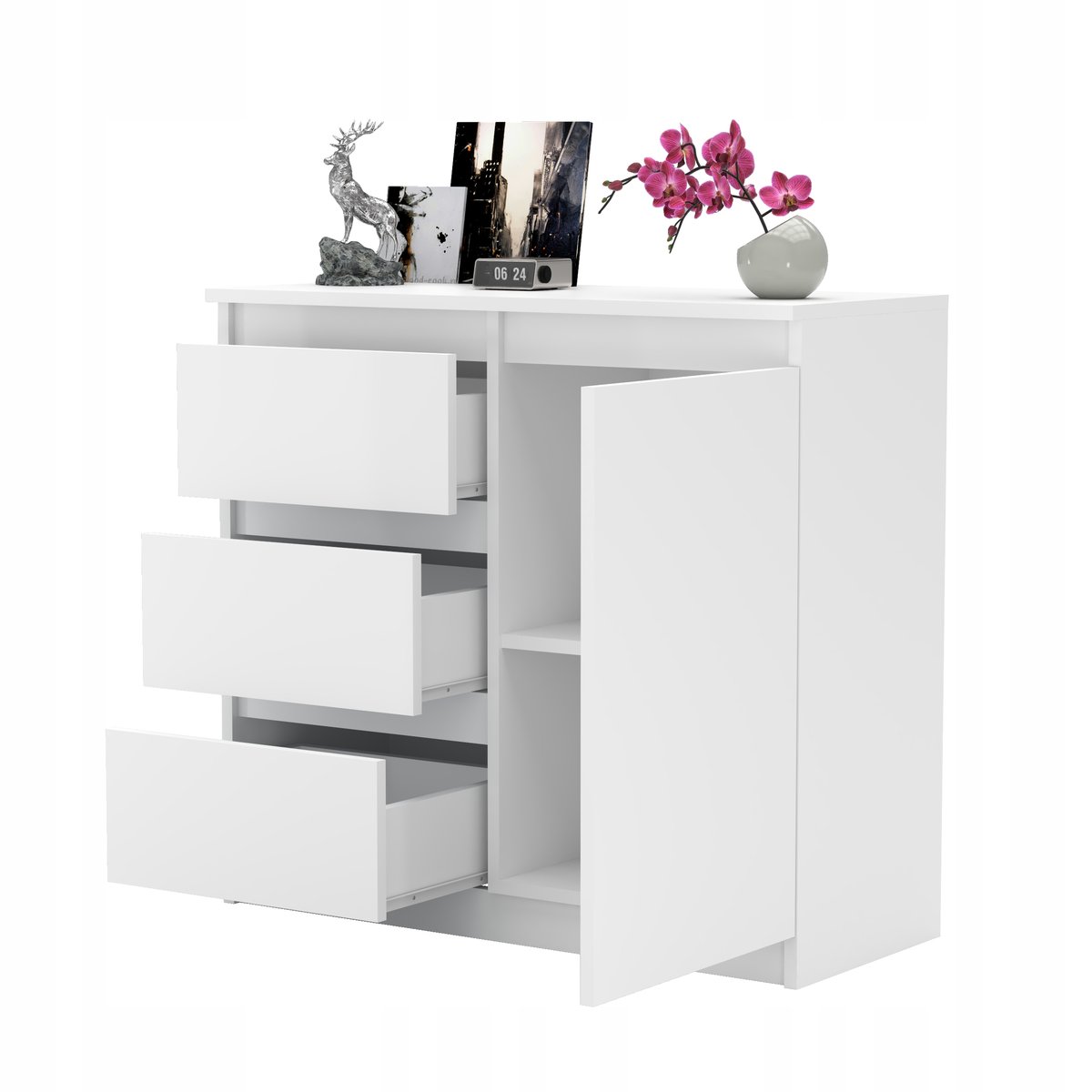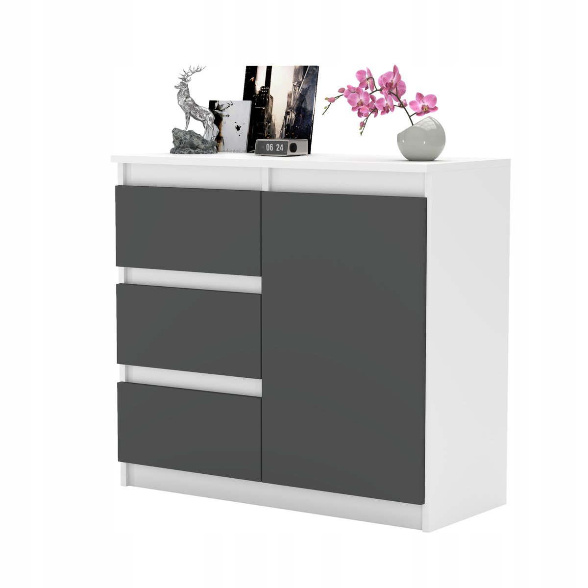 Blat: Górna powierzchnia komody może być wykorzystywana do eksponowania dekoracji, takich jak ramki na zdjęcia, rośliny, czy lampki.