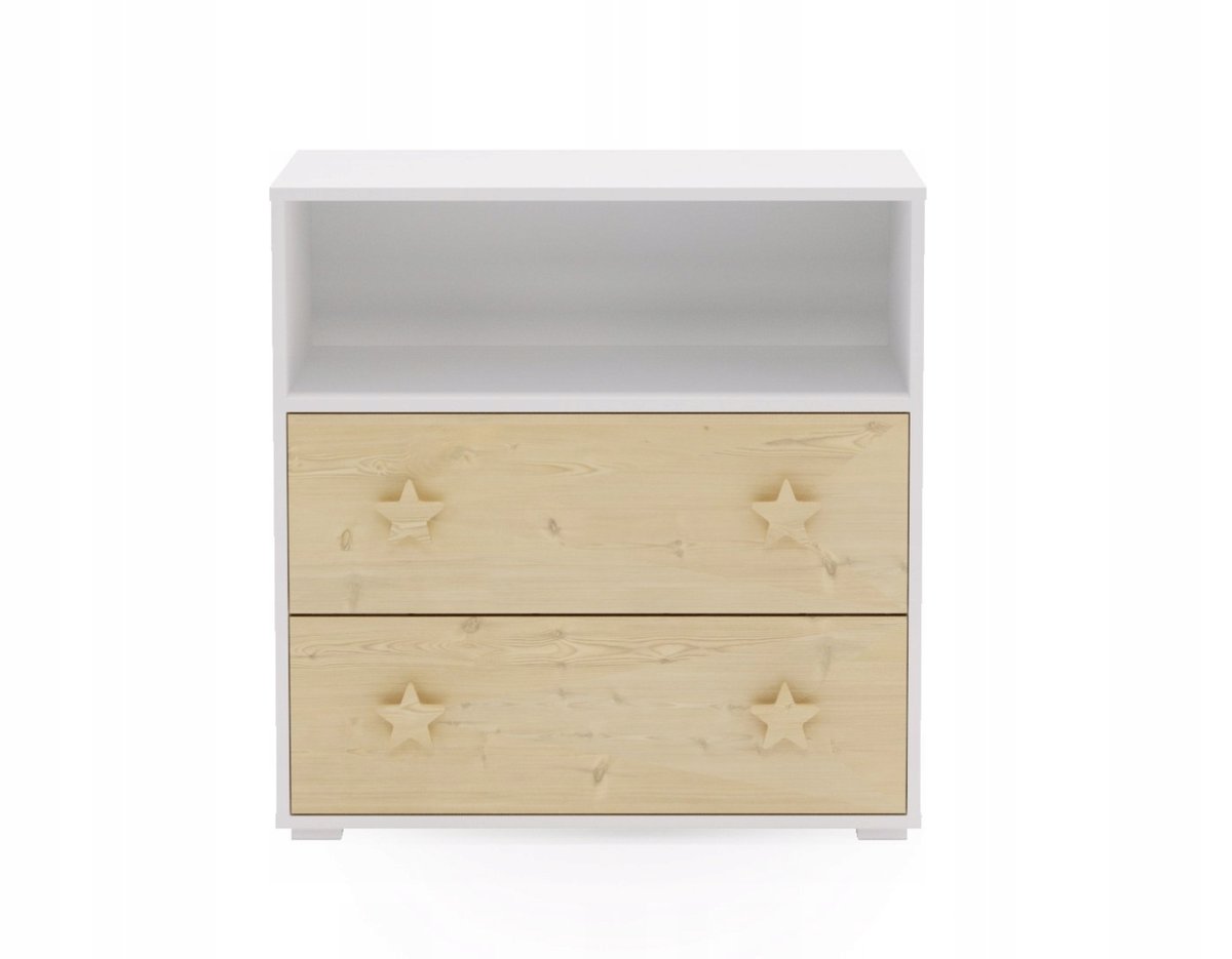 Komoda II PUFFI łączy nowoczesny styl z funkcjonalnością oraz komfortem codziennego użytkowania. Szafka wyposażona została w półkę oraz dwie pojemne szuflady, które zapewniają przestrzeń do przechowywania ubrań lub innych przedmiotów ukrytych przed wzrokiem, co pomaga utrzymać porządek. Komoda II PUFFI to doskonały wybór do pokoju dziecięcego lub młodzieżowego. Biały kolor w połączeniu z klonem prezentuje się stylowo i harmonijnie. Ciekawym akcentem są uchwyty w kształcie gwiazdek, które nadają charakteru i sprawiają, że komoda jest atrakcyjna wizualnie.
