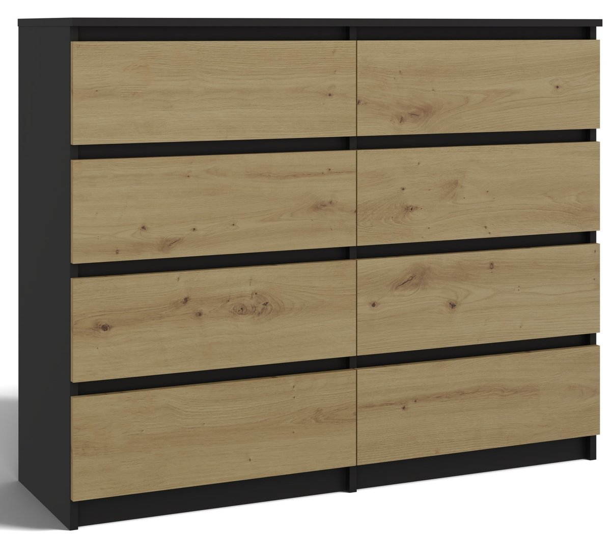 Połączenie antracytowego korpusu z frontami w kolorze dąb artisan nadaje komodzie nowoczesny, a zarazem elegancki wygląd, który świetnie komponuje się z różnymi aranżacjami wnętrz – zarówno minimalistycznymi, jak i loftowymi.