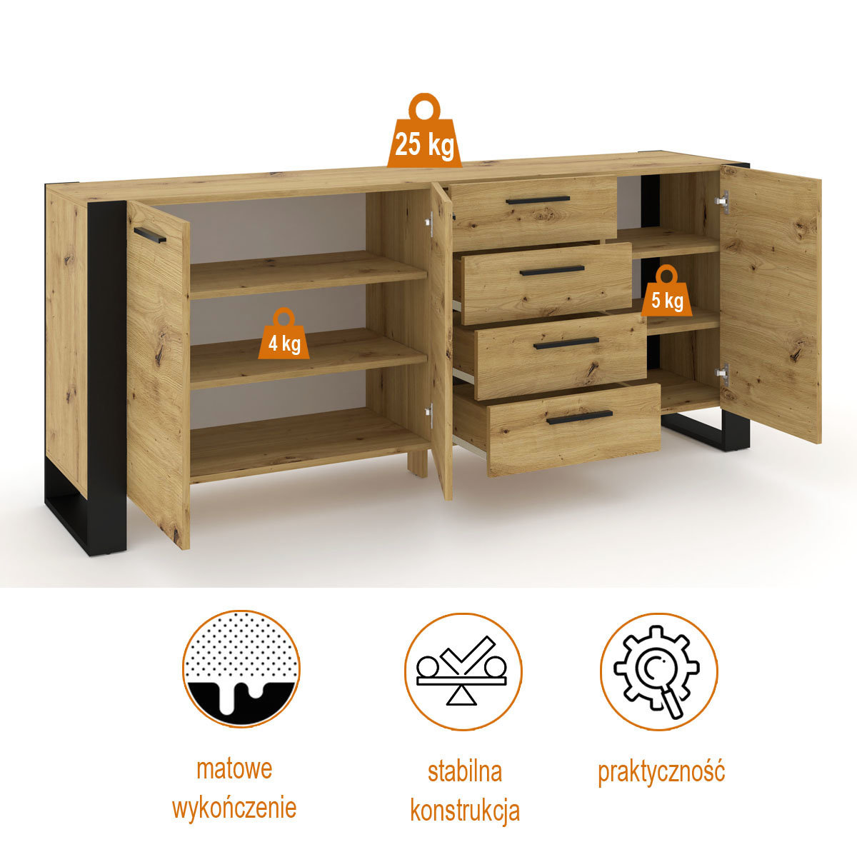 Niezwykle elegancka i stylowa komoda do salonu lub sypialni wykonana w modnej i naturalnej kolorystyce. Charakteryzuje się nowoczesnym i przyjemnym dla oka wyglądem - o jej uroku decydują duże czarne nogi w formie ramy, które pięknie kontrastują z resztą mebla. Szafka posiada dwie zamykane przestrzenie, za którymi znajdują się półki. W komodzie znajdują się również cztery szuflady.