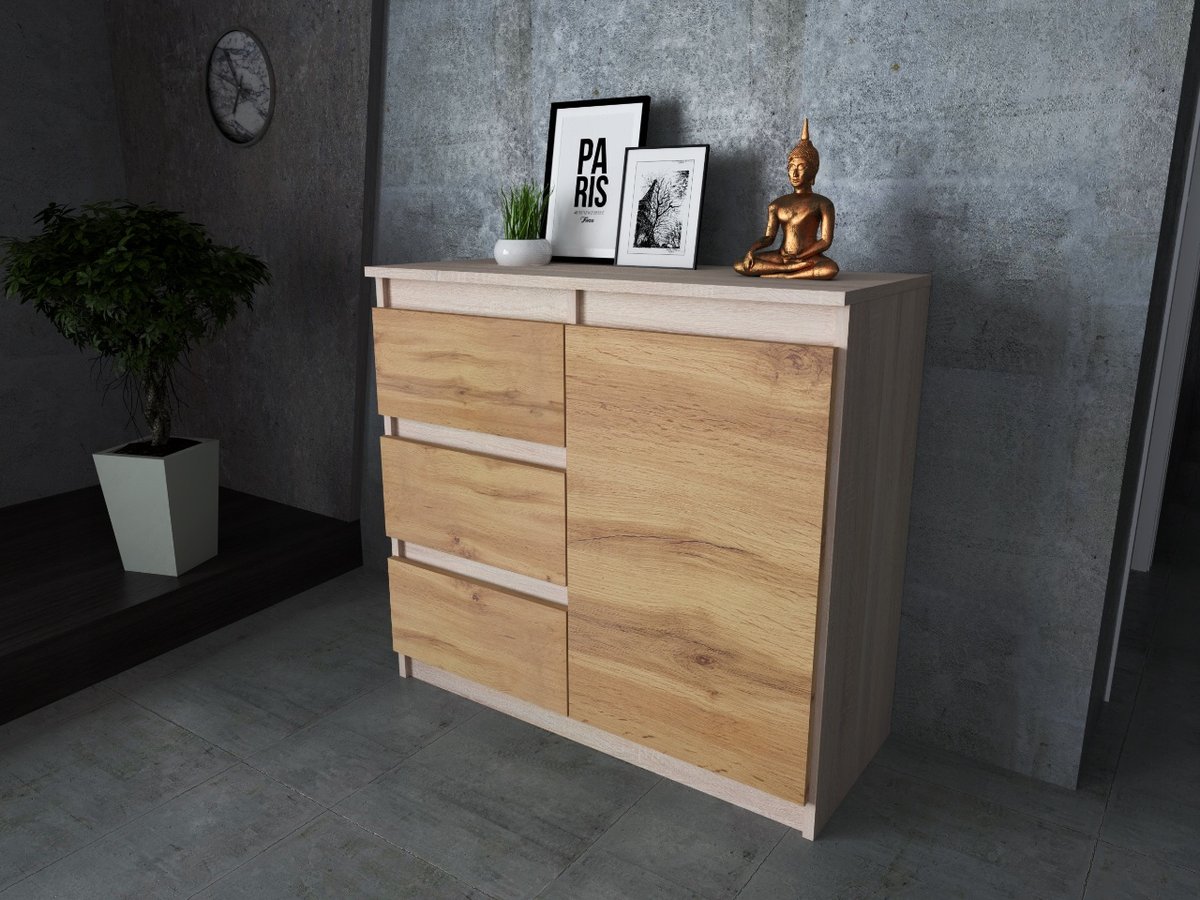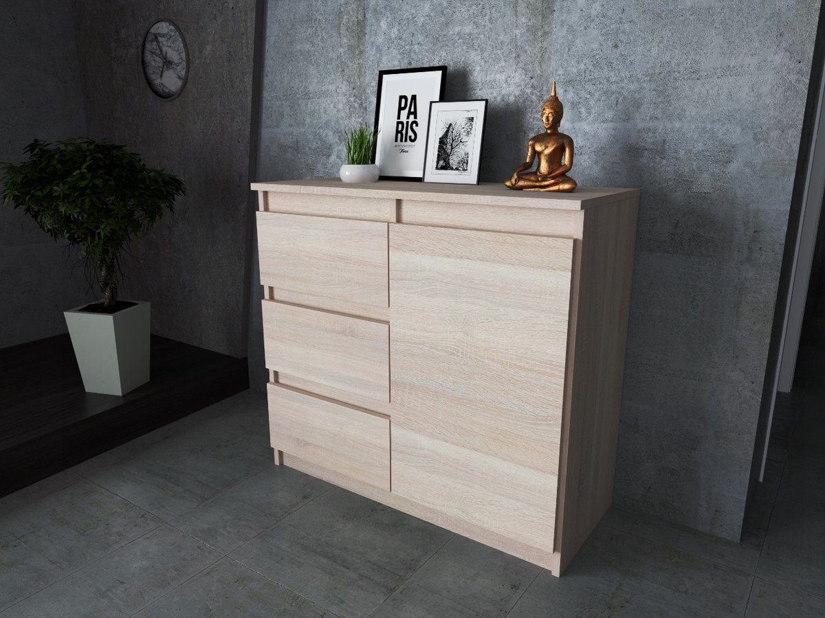 Komoda sprawdzi się w każdym mieszkaniu. Została wykonana ze starannie wyselekcjonowanych materiałów, co przekłada się nie tylko na efektowny design, ale również nieprzeciętną wytrzymałość. Uwagę przykuwa jej przepiękne i nowoczesne wzornictwo, genialnie wpasuje się w trendy wystroju wnętrz.