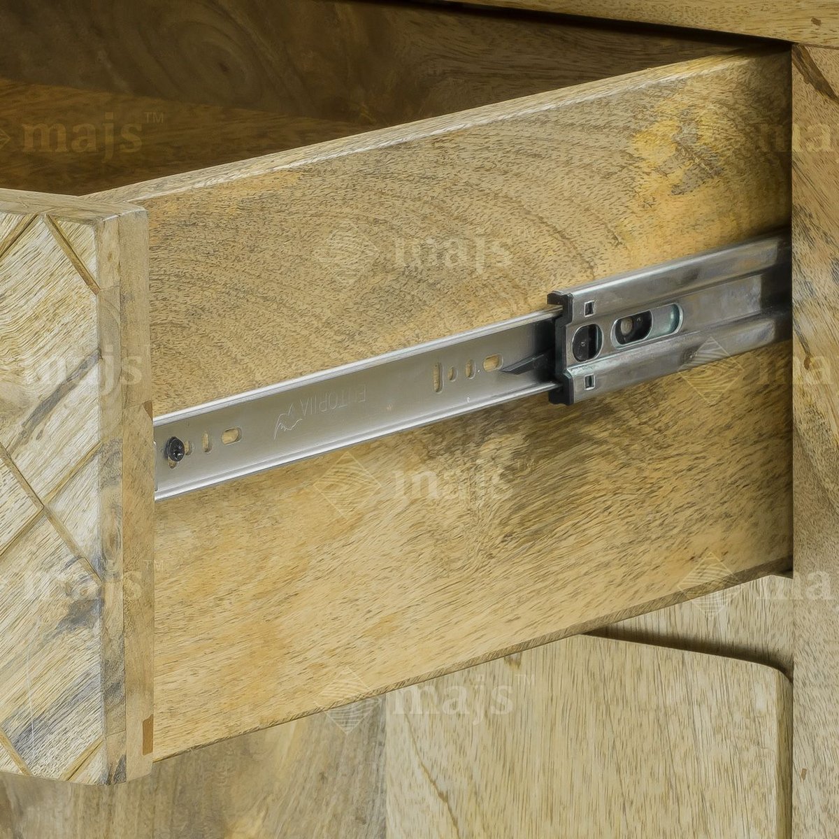 Szuflady zamontowane zostały na teleskopowych, metalowych prowadnicach, ułatwiających wysuwanie i wsuwanie szuflady. Teleskopowy mechanizm umożliwia całkowite wysunięcie szuflady ułatwiając dostęp do zawartości szuflady. Fronty szuflad ręcznie zdobione kwadratowymi elementami z mangowca o różnorodnym usłojeniu i złotym aplikacjom.