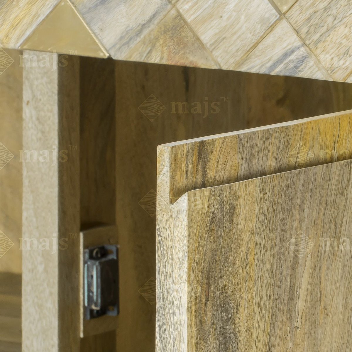 Komoda z 3 przestronnymi szafkami z półką oraz 3 pojemnymi szufladami. Wszystkie jej elementy tj. korpus, szuflady (włączając dno i ściany), tylna ściana mebla, wykonane zostały w całości z litego, egzotycznego drzewa mangowca indyjskiego. Jego bardzo duża gęstość sprawia, że jest on ciężki i zbity. Drewno mango nie przyjmuje wody i nie odkształca się pod wpływem wilgoci.