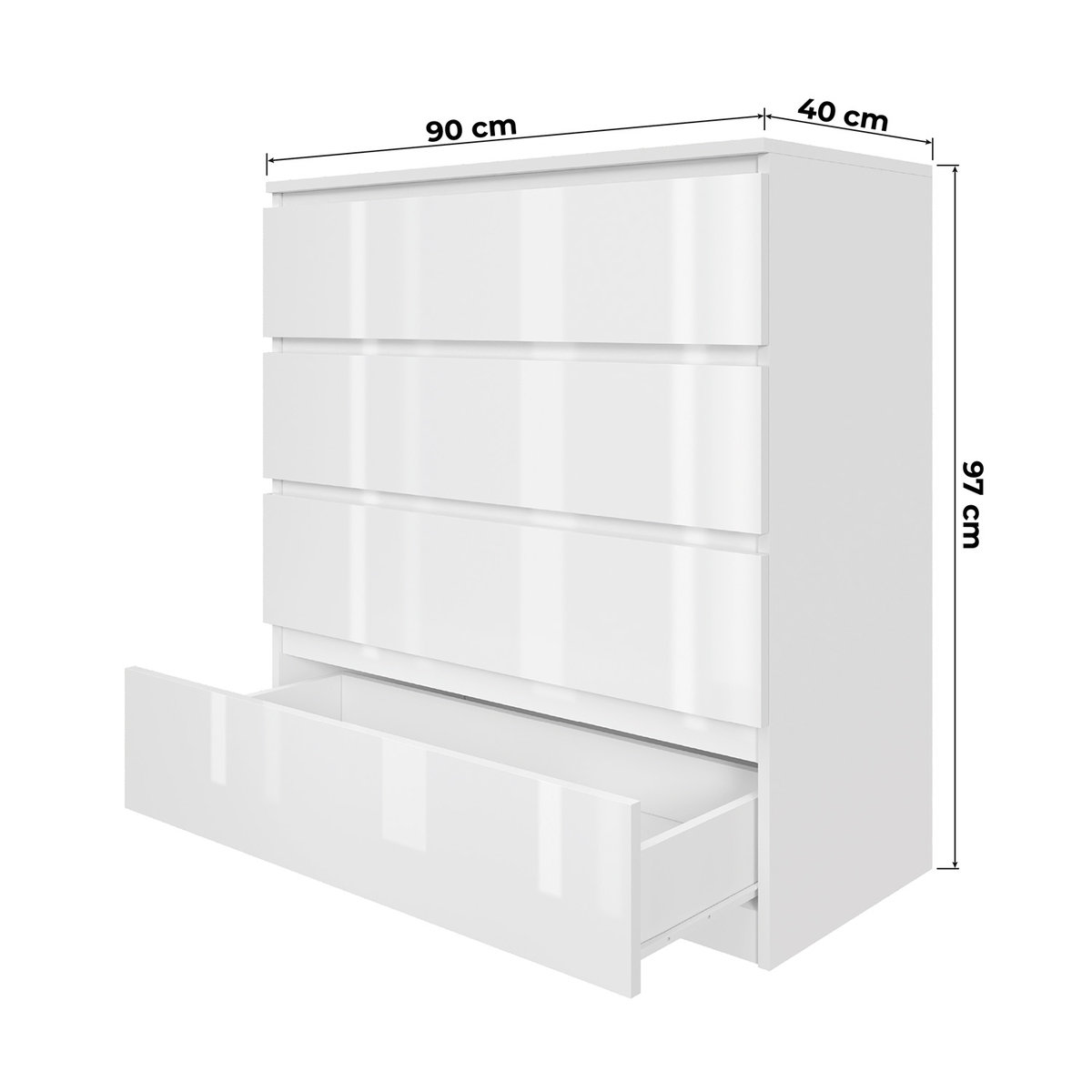 Komoda BIAŁA LAKIEROWANA 90 cm z 4 szafkami to elegancki i praktyczny mebel dla osób ceniących nowoczesne wnętrza. Lakierowane wykończenie w połysku nadaje jej prestiżowego charakteru, a cztery przestronne szafki gwarantują wygodne przechowywanie różnych przedmiotów.