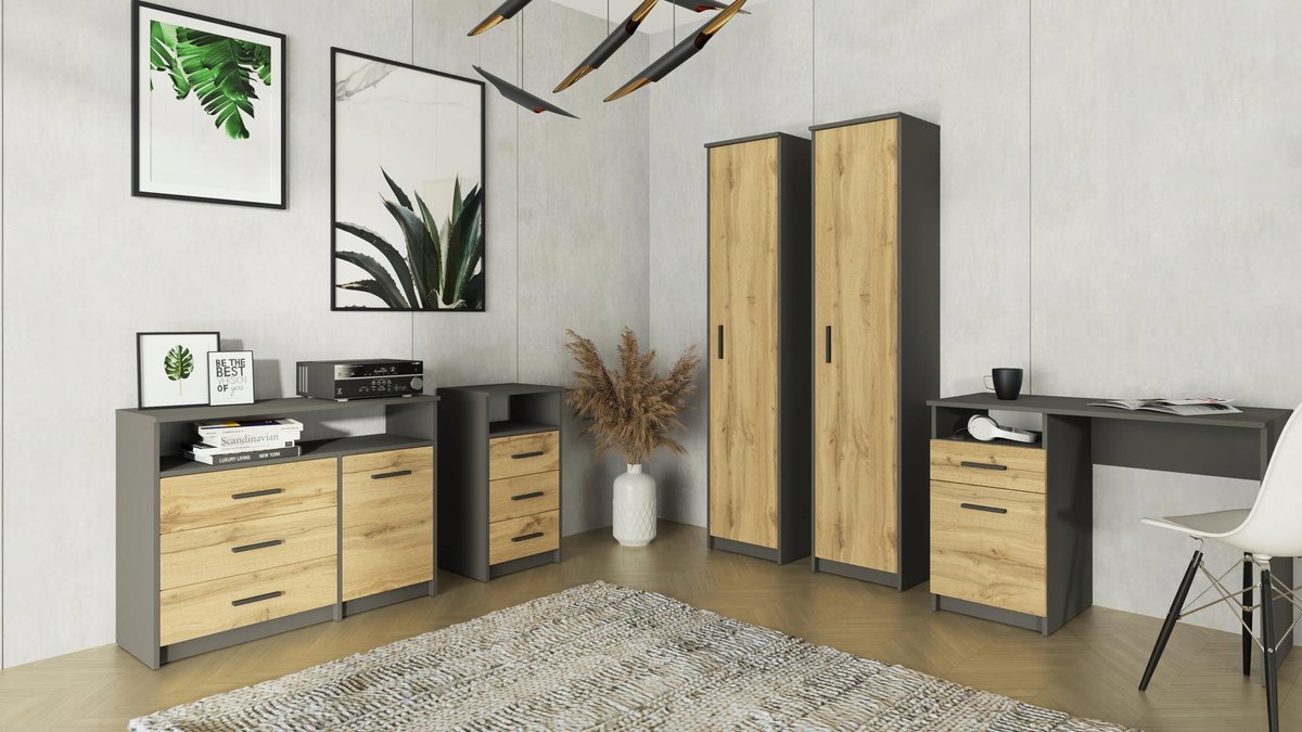 Komoda szafka BODO 1D3SO grafit-wotan antracyt szuflady regał UFCKomoda wykonana jest z dobrej jakości płyty laminowanej o grubości 16mm, którą cechuje zwiększona odporność na zarysowania, wysoka ...
