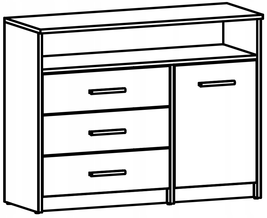 Komoda składa się z części z szufladami z lewej strony, szafki z półką z prawej strony i otwartej półki nad szufladami i szafką.