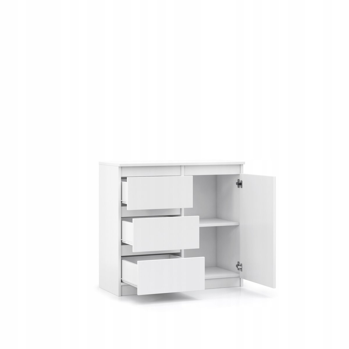 SPECYFIKACJA:✅ Kolor: Biały ✅ Waga: 42 kg ✅ Długość: 80 cm ✅ Wysokość: 75 cm ✅ Głębokość: 35 cm ✅ Przy produkcji zastosowano obrzeże PCV. ✅ Komoda wykonana z najwyższej jakości płyty laminowanej 16 mm. ✅ Tył komody wykonany z płyty HDF w kolorze białym. ✅ Wyposażona w 3 pojemne szuflady na prowadnicach rolkowych. ✅ Komoda przeznaczona do samodzielnego montażu. ✅ W zestawie znajduje się obrazkowa instrukcja montażowa i opis w języku polskim. | |