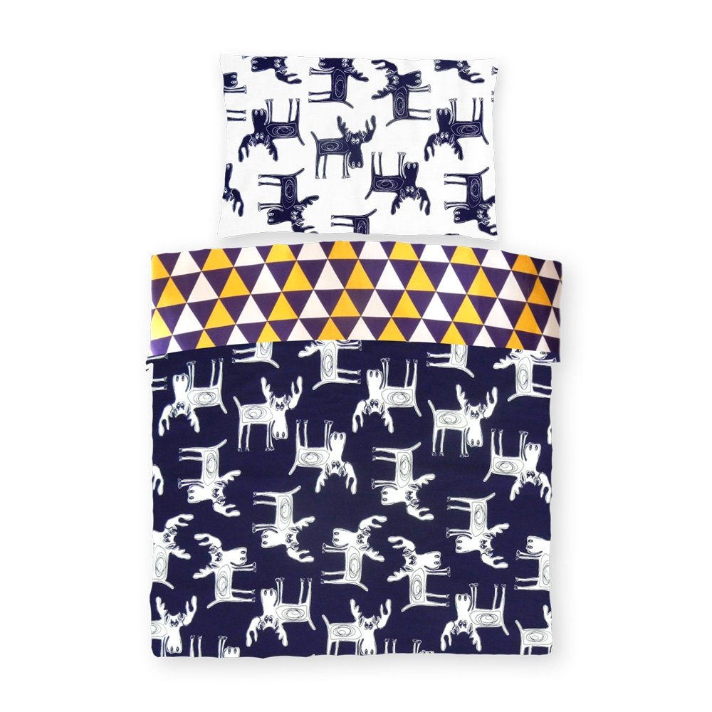 Pościel wykonana jest z wysokogatunkowej, naturalnej bawełny a uniwersalnym dziecięcym wzorem białych reniferów na granatowym tle.