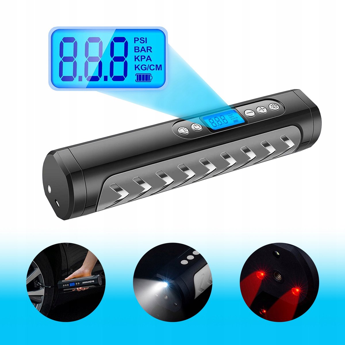 KOMPRESOR SAMOCHODOWY ROWEROWY 150 PSI LED 80W UNIWERSALNY AKUMULATOR ✅ POMPKA AKUMULATOROWA DO ROWERU SAMOCHODU KOMPRESOR ELEKTRYCZNY Z WYŚWIETLACZEM I KOŃCÓWKAMICiśnienie ...