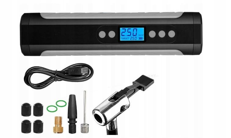 ✅ POMPKA AKUMULATOROWA DO ROWERU SAMOCHODU KOMPRESOR ELEKTRYCZNY Z WYŚWIETLACZEM I KOŃCÓWKAMI