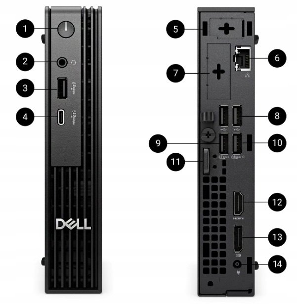 1. Przycisk zasilania | 2. Uniwersalne gniazdo audio (mini jack 3,5 mm) | 3. USB 3.2 Gen 1 (5 Gb/s) Type-A | 4. USB-C 3.2 Gen 2 (10 Gb/s) | 5. Gniazdo anteny Wi-Fi (opcjonalne) | 6. RJ-45 | 7. Slot na moduł opcjonalny (np. DisplayPort / VGA / USB-C / HDMI – zależnie od konfiguracji) | 8. 2× USB-A 2.0 | 9. Śruba skrzydełkowa do otwierania obudowy | 10. 2× USB-A 3.2 Gen 1 (w tym jeden z funkcją SmartPower On) | 11. Slot na zabezpieczenie Kensington | 12. HDMI 2.1 | 13. DisplayPort 1.4a | 14. Złącze zasilania