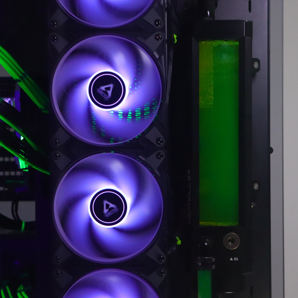 - Gruuuuba chłodnica – ten konfig ma tylko jedną, ale za to konkretną chłodnicę – 480 o grubości 85mm (!) z aż ośmioma wentylatorami ARGB w układzie PUSH-PULL.