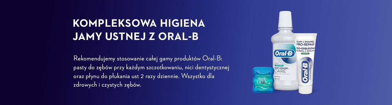 Amerykańska marka Oral-B od 1950 roku dba o zdrowie jamy ustnej milionów ludzi na świecie. Znana jest przede wszystkim z innowacyjnych szczoteczek elektrycznych, wprowadzając na rynek technologie oscylacyjno-rotacyjne już w 1963 roku. Marka jest najczęściej używana i rekomendowana przez dentystów na świecie. Produkty Oral-B pomagają skutecznie usuwać płytkę nazębną, zapobiegać próchnicy i dbać o zdrowie dziąseł. Szeroki wybór pozwala dobrać odpowiednie produkty do każdego rodzaju zębów i potrzeb.