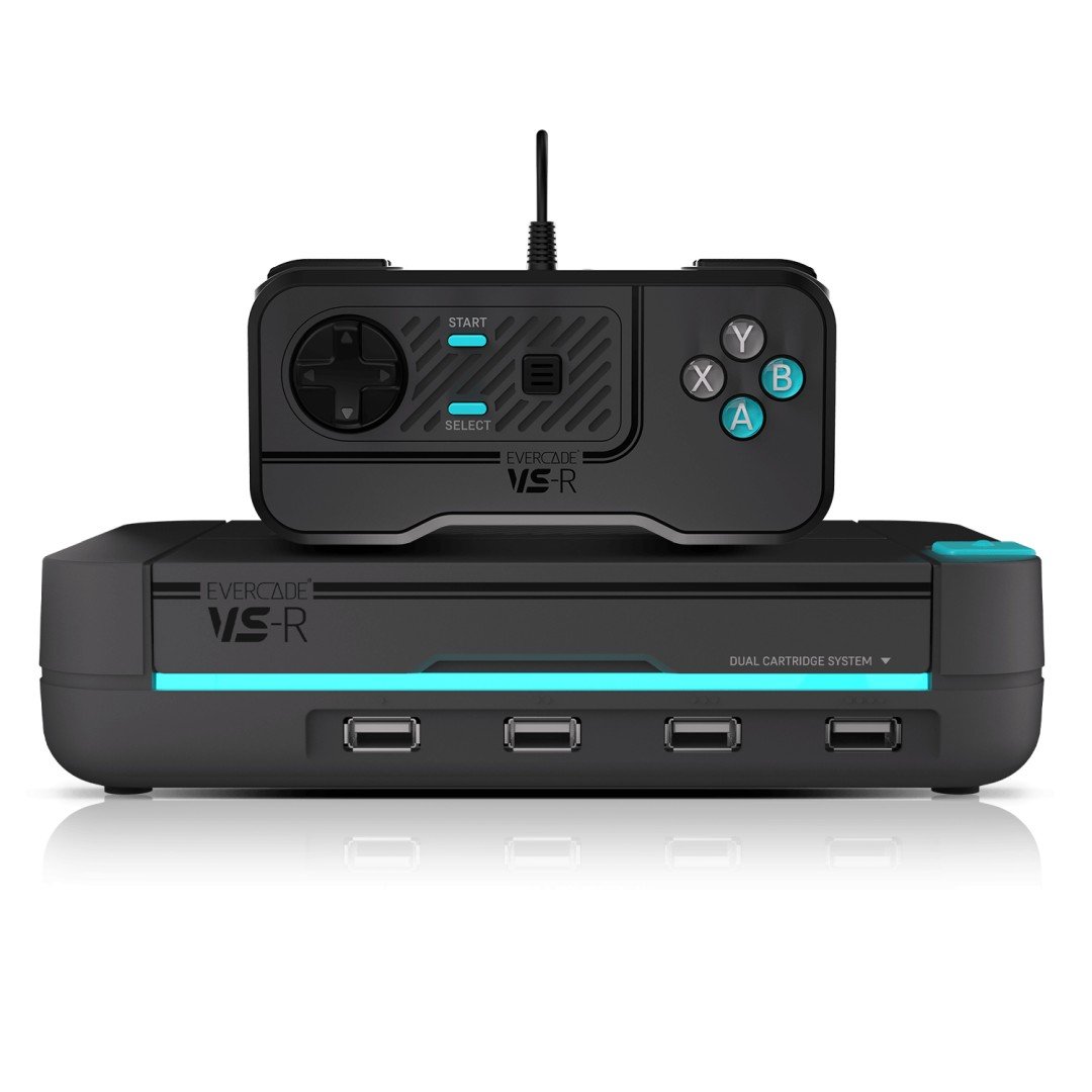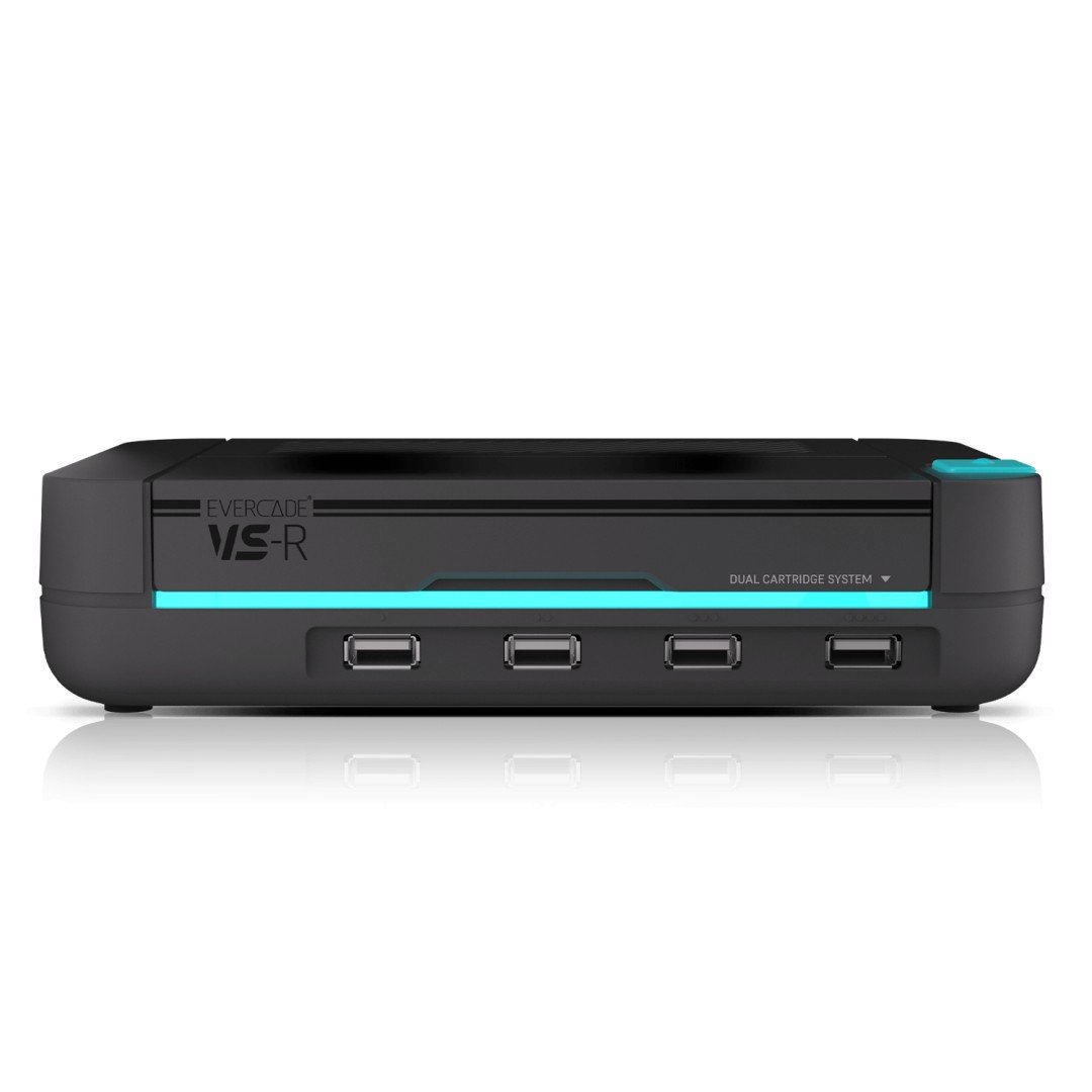 Evercade VS-R posiada podwójne gniazdo na kartridże dla większego wyboru gier, 4 porty USB dla trybu multiplayer dla 4 graczy oraz wbudowane WiFi dla łatwych aktualizacji. W zestawie gracz otrzymuje jeden kontroler, ale pady można również dokupić osobno – sprzęt obsługuje również kontroler Evercade VS Classic i wiele kontrolerów USB innych firm.