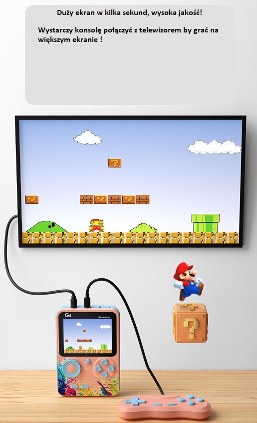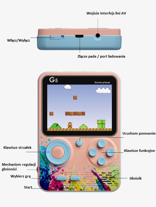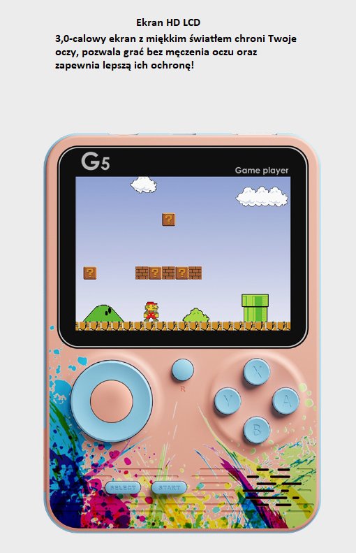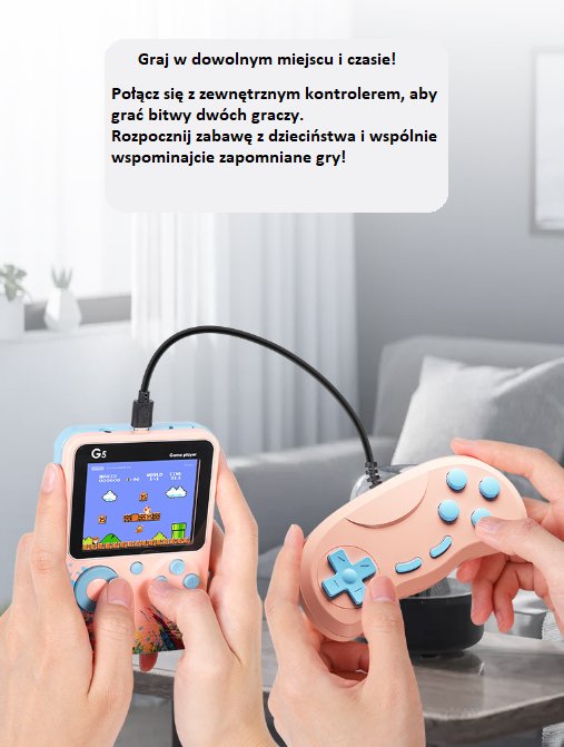 Przenieś się do świata klasycznych gier z przenośną konsolą G5! Ta kompaktowa konsola to idealne rozwiązanie dla fanów retro rozrywki – zarówno młodszych, jak i starszych graczy.