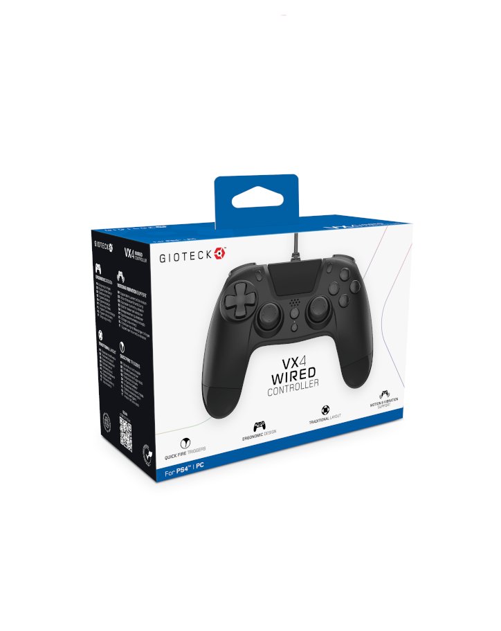 Gioteck VX4 to przewodowy kontroler klasy premium. Kompatybilny jest z konsolą PS4, PS4 PRO i PS4 Slim oraz PC. Ergonomiczny kształt oraz optymalne rozmieszczenie przycisków wzorowane na klasycznym padzie Playstation. Pad znakomicie leży w dłoniach, a dzięki wysokiej jakości materiałom będziemy się nim cieszyć przez długi czas. W padzie zastosowano precyzyjny D-Pad, przyciski quick-fire oraz antypoślizgowe, gumowe drążki analogowe w celu uczynienia sterowania jak najwygodniejszym. To idealny kompan na wielogodzinne sesje grania. Pad wyposażony został w port audio 3,5 mm do podłączenia słuchawek lub zestawu słuchawkowego, pozwoli to grać komfortowo i z pełnym dźwiękiem nawet w nocy, nie uprzykrzając życia pozostałym domownikom.