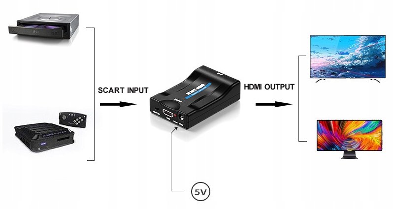 KONWERTER PRZEJŚCIÓWKA ADAPTER Z SCART NA HDMI AV EURO FULL HD 1080PPrzejściówka z SCART do HDMI to niewielkie urządzenie służące do konwertowania obraz oraz dźwięku analogowego na ...