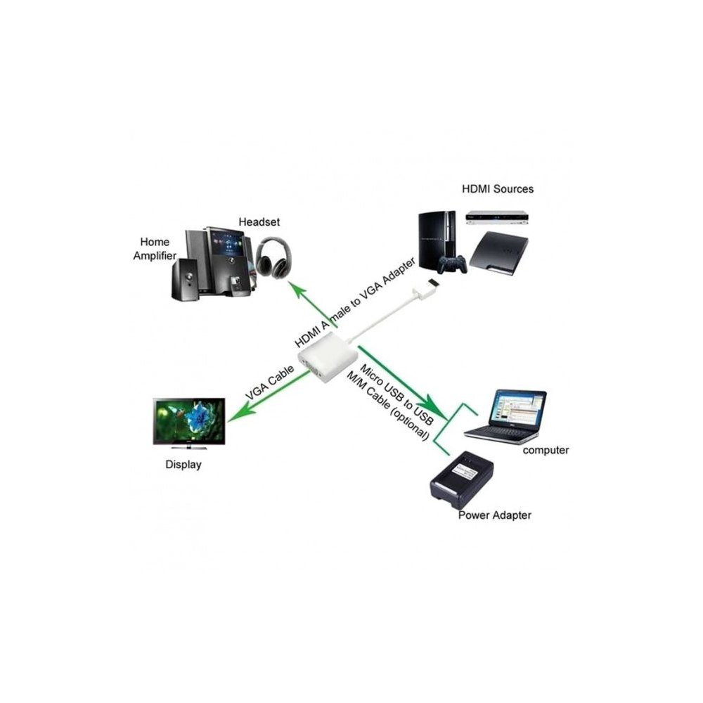 Opis produktu: Konwertuje cyfrowy sygnał HDMI na analogowy VGA Umożliwia podłączenie cyfrowego źródła sygnału wideo z portem HDMI do starszych wyświetlaczy analogowych z portem VGA Wyjście AUDIO