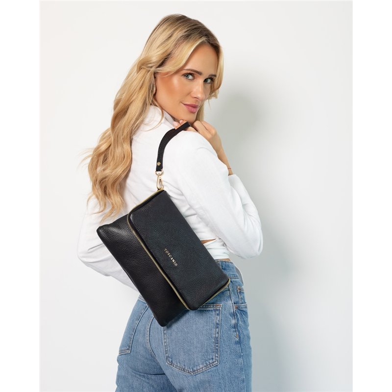 Torebka ma praktyczne wymiary: wysokość 20 cm, szerokość 26 cm oraz głębokość 4 cm, co sprawia, że jest wystarczająco pojemna, by pomieścić wszystkie niezbędne drobiazgi, a jednocześnie na tyle smukła, by zachować elegancki wygląd. Posiada jedną główną komorę, w której znajduje się jedna kieszeń oraz jedną kieszeń zewnętrzną, co ułatwia organizację.