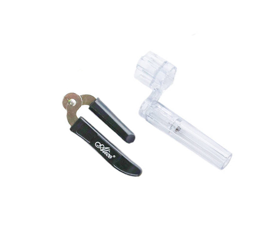 Zestaw korbka, obcinarka do strun A1009 A Korbka Kolor: Przezroczysty Materiał: ABS Uchwyt do wyciągania kołków Obcinaczka do strun wykonana z metalu Opakowanie blister