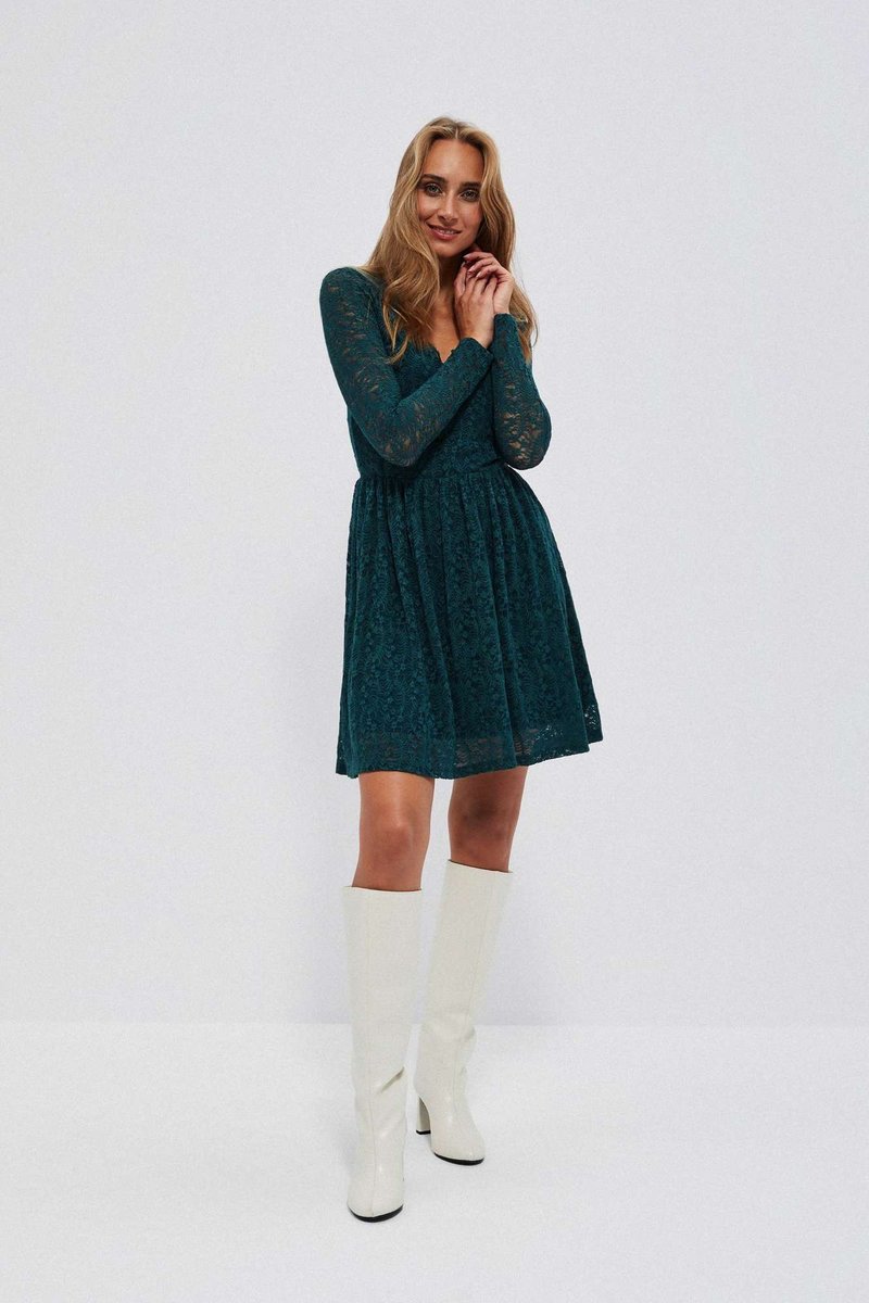 90%POLIAMID, 10%ELASTAN. Turkusowa, koronkowa sukienka. Rozkloszowany, dziewczęcy krój. Pod koronką jest podszewka. Z przodu i z tyłu jest dekolt typu V-neck. Z tyłu ozdobne, delikatne wiązanie na dekolcie. Długie prześwitujące rękawy wykonane z koronki. Długość przed kolano. Rozkloszowany, lekki fason. Sukienka ładnie podkreśla talię. Sukienka doskonale się układa, a jej noszenie jest niezwykle komfortowe.
