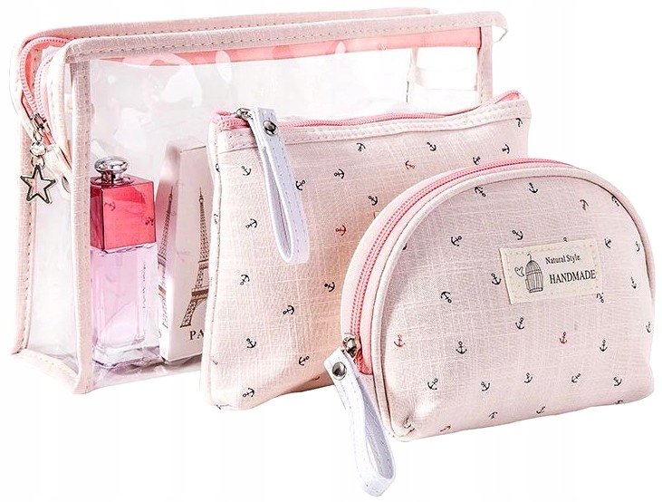 Zestaw składa się z trzech kosmetyczek jedna jest przezroczysta a dwie materiałowe