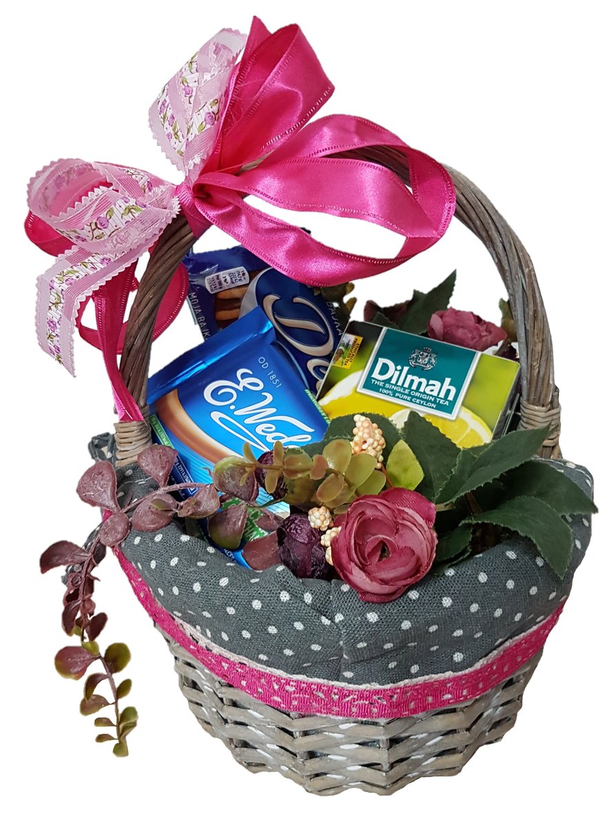 Zawartość koszyczka: Delicje Szampańskie 147 g E. Wedel;czekolada 100 g Dilmah;herbata o smaku cytrynowym;20 torebek Sztuczne kwiaty Oferowane przez nas koszyczki mają podkład w postaci wełny ...