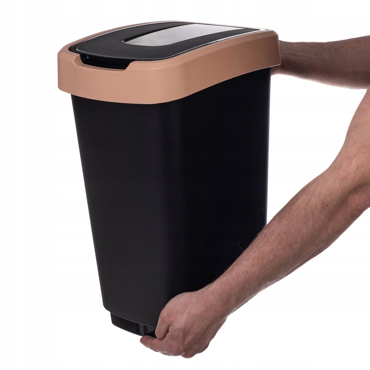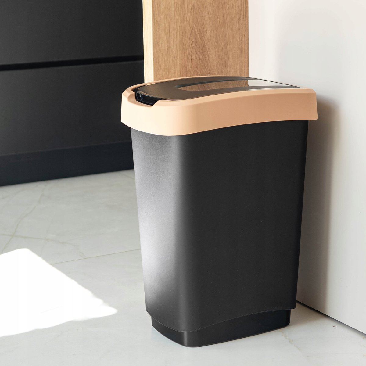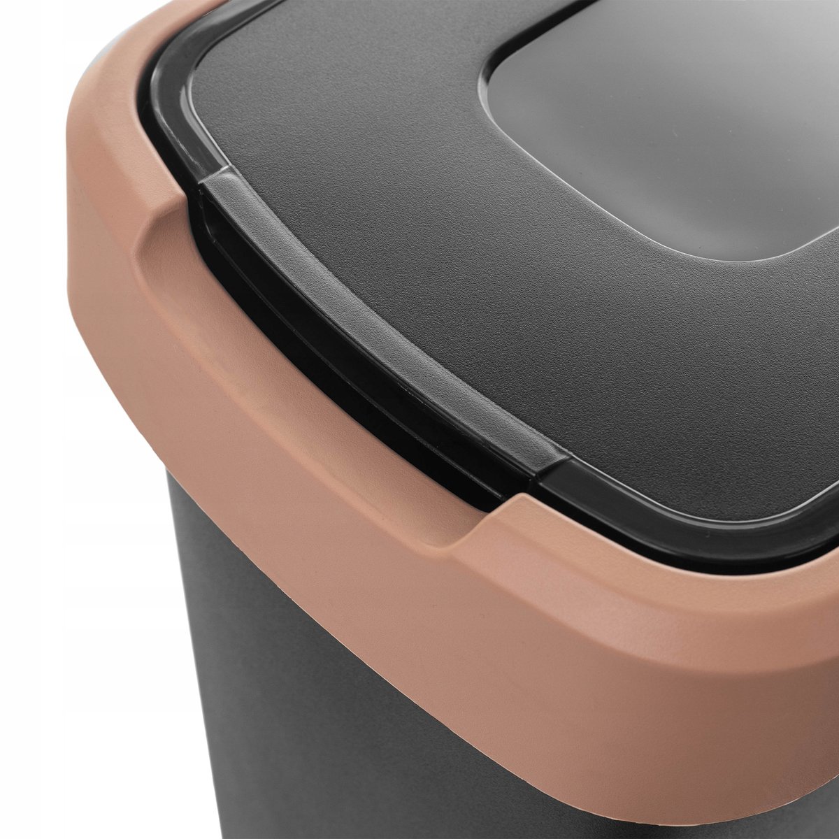 Stonowany korpus w kolorze czarnym, zestawiony z pastelową pokrywą czyni kosz nie tylko praktycznym, ale i estetycznym dodatkiem.