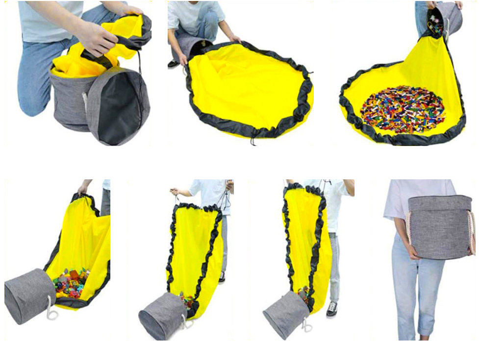 Praktyczny kosz do przechowywania klocków i innych zabawek z matą do zabawy. Dzięki niemu w kilka chwila stworzysz miejsce do zabawy dla malucha na macie, która chroni podłogę przez zarysowaniem oraz zabawki przed zgubieniem.