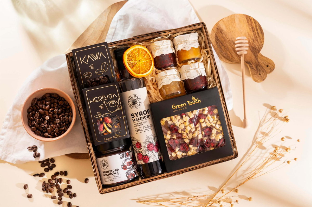 Kosz prezentowy box prezent syrop czekolada konfitury upominek herbata kawa Kosz prezentowy zawiera: Herbata marki Green Touch w ozdobnym minimalistycznym czarnym pudełku 15 g. Doskonała ...