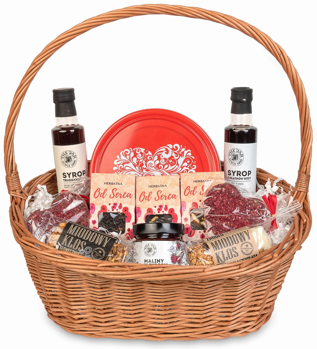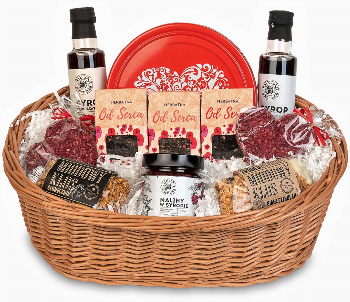Kosz prezentowy duży od serca z ciastkami i herbatą syropy czekolady zestaw podziękowanie