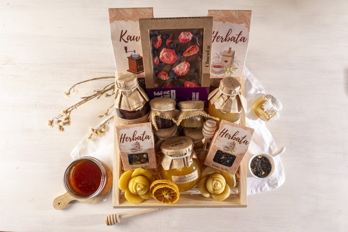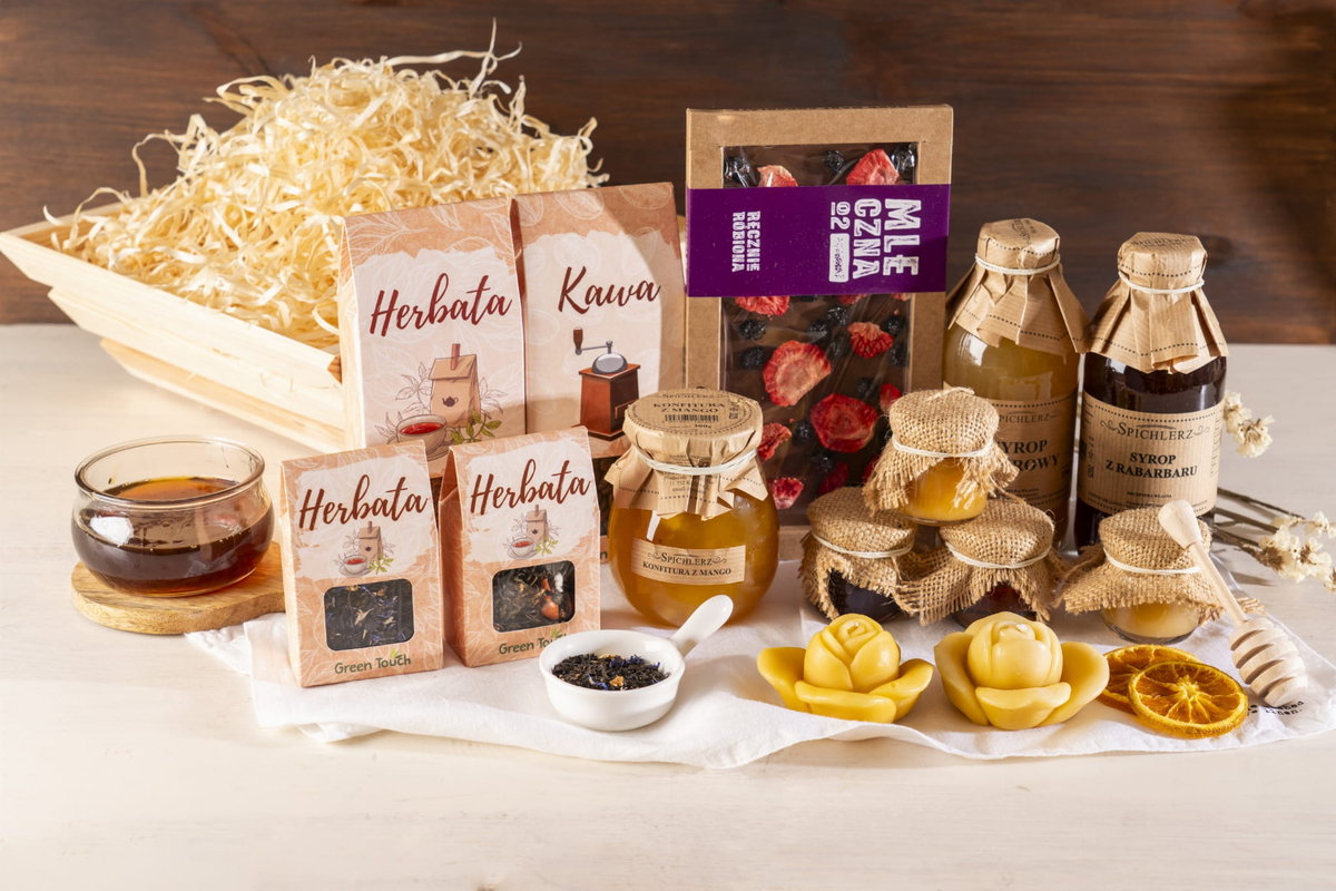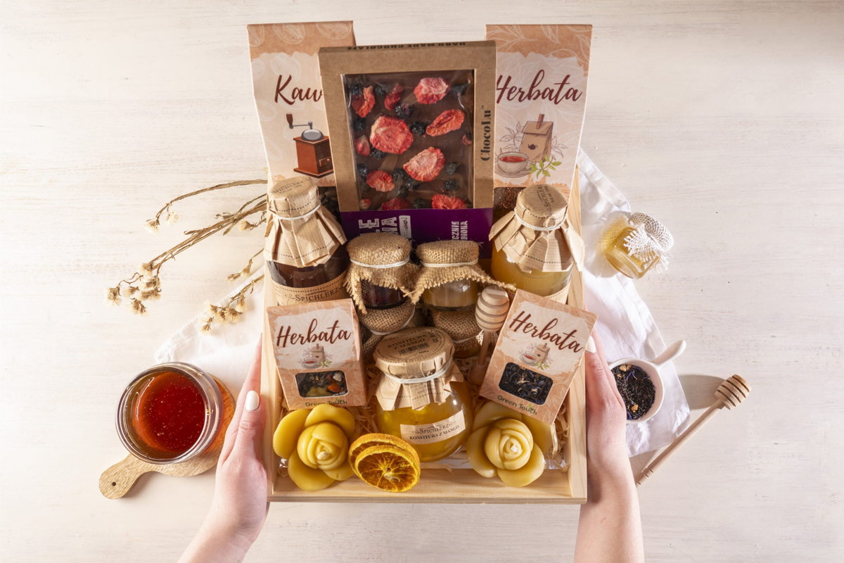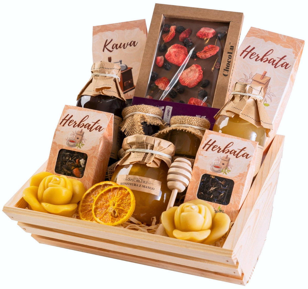 Kosz prezentowy kraftowy zestaw herbat skrzynka kawa czekolada syropy świece miód