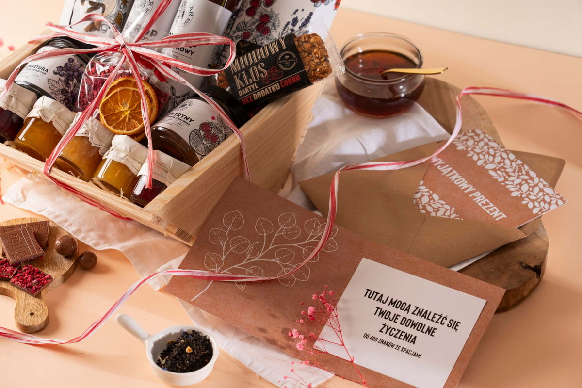 Właśnie zrecenzowałem Kosz prezentowy kraftowy zestaw herbat skrzynka kawa czekolada syropy świece miód