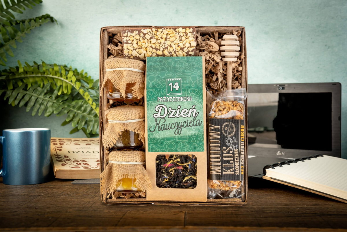 Kosz prezentowy na dzień nauczyciela zestaw herbata słodycze z nadrukiem
