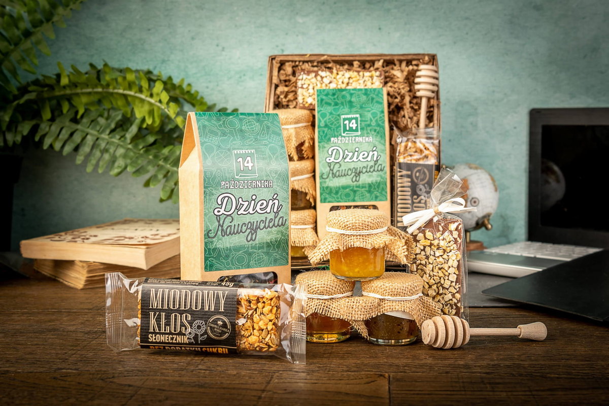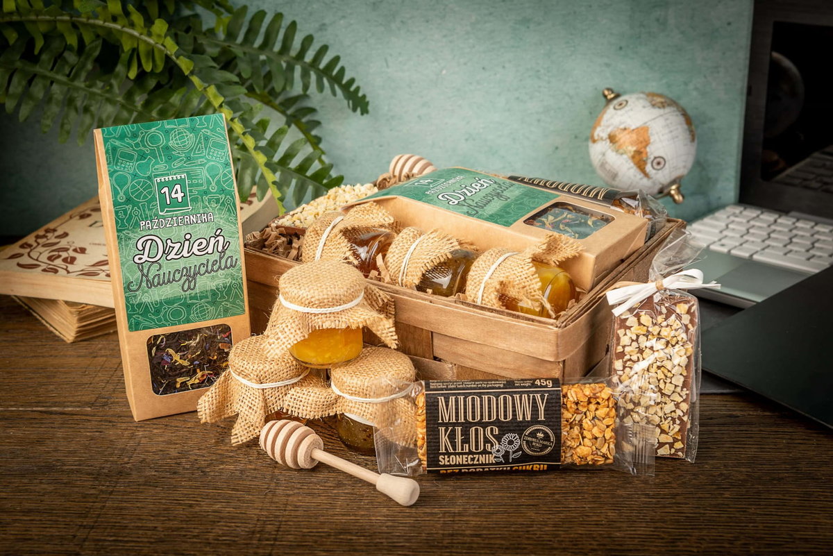 Nasz kosz prezentowy to mieszanka wyrafinowanych smaków. Wewnątrz znajdziesz smakowitą herbatę czarną w okazjonalnym pudełku;a do tego dwie konfitury: z kiwi i pomarańczy. Miłośników słodkości ucieszy miód wielokwiatowy oraz miodowy baton z ziarnami słonecznika. Dodajemy także mini tabliczkę czekolady z liofilizowanymi owocami i praktyczny drewniany nabierak do miodu. Ten zestaw to idealny sposób;aby podziękować nauczycielowi.