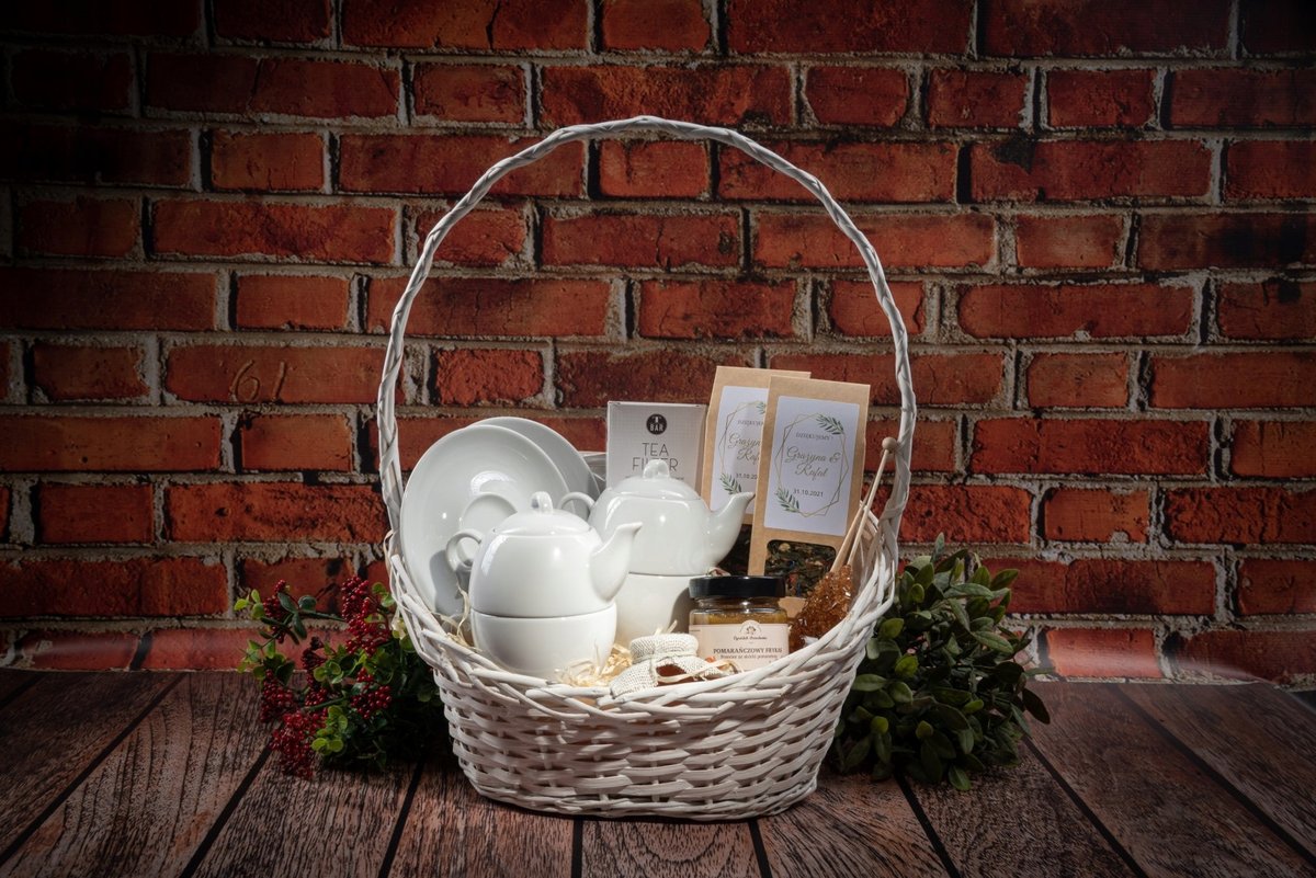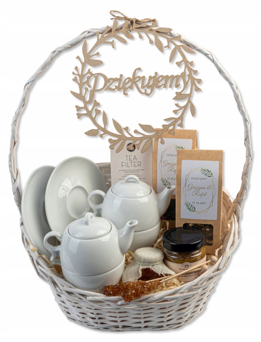 | Nazwa: | Wiklinowy biały kosz prezentowy;podziękowania dla rodziców;personalizowany z herbatą i filiżankami |