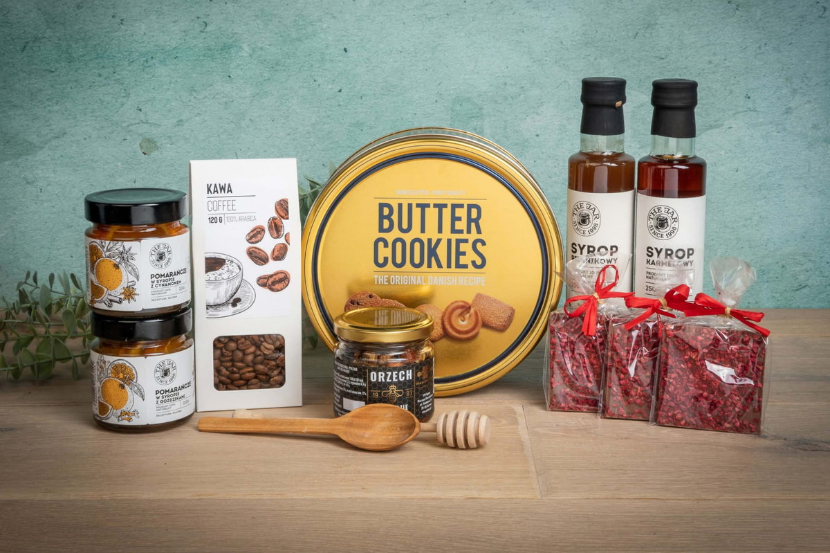 | Nazwa: | Kosz prezentowy wiklinowy zestaw ciastka czekolady kawa przetwory syropy |