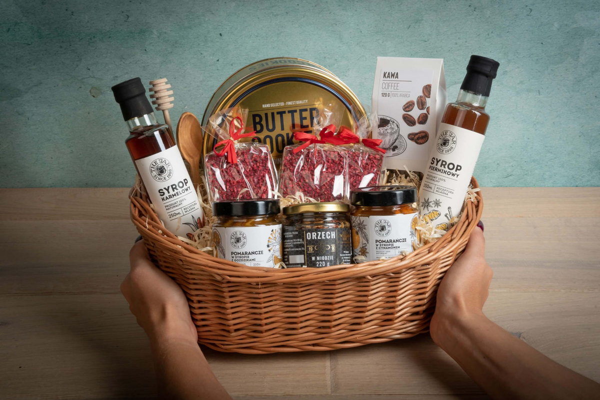 Właśnie zrecenzowałem Kosz prezentowy wiklinowy zestaw ciastka czekolady kawa przetwory syropy
